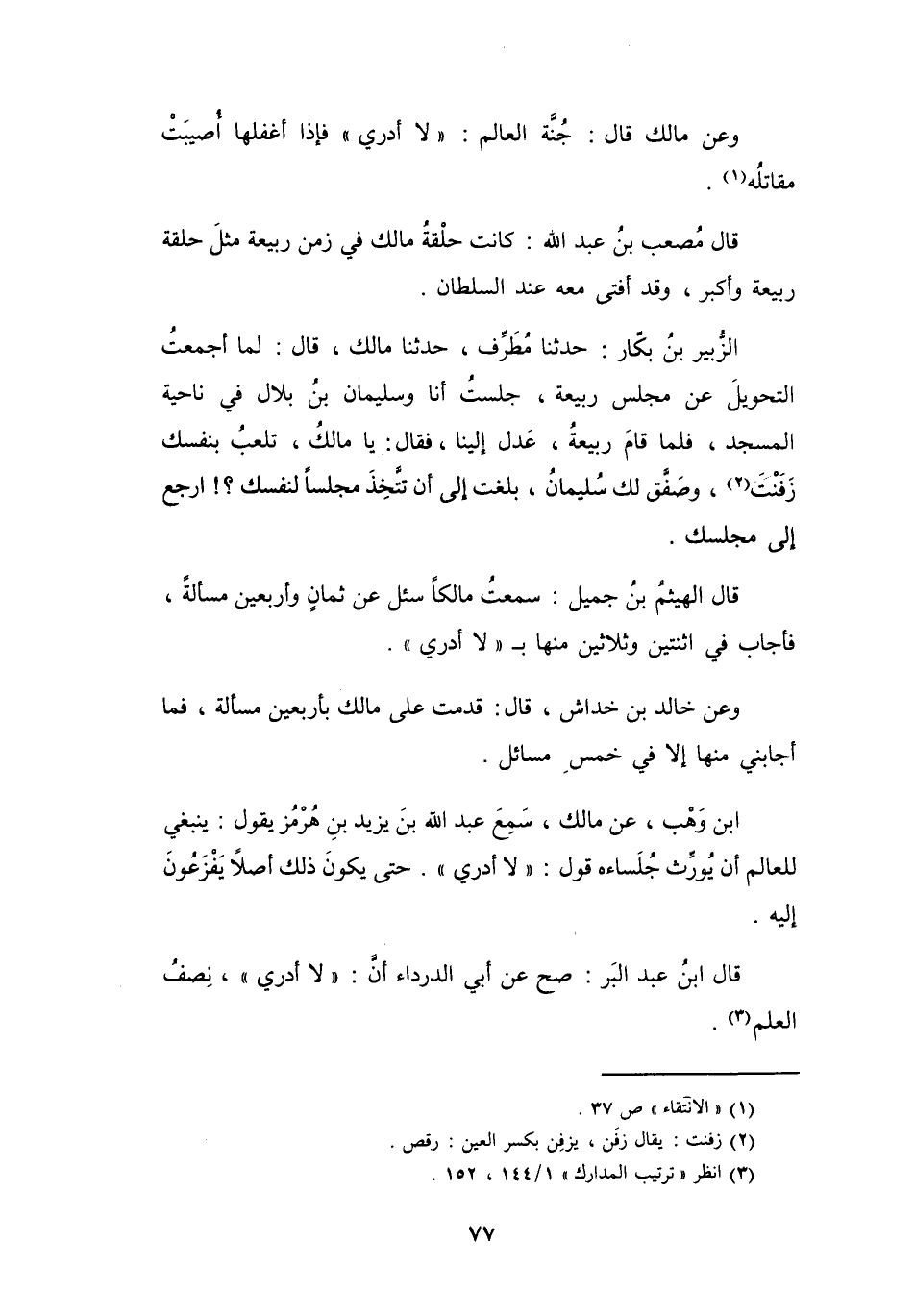 وَعَنْ مَالِكٍ، قَالَ: جُنَّةُ العَالِمِ: (لاَ أَدْرِي) ، فَإِذَا أَغفَلَهَا أُصِيْبَتْ مَقَاتِلُهُ (1) .