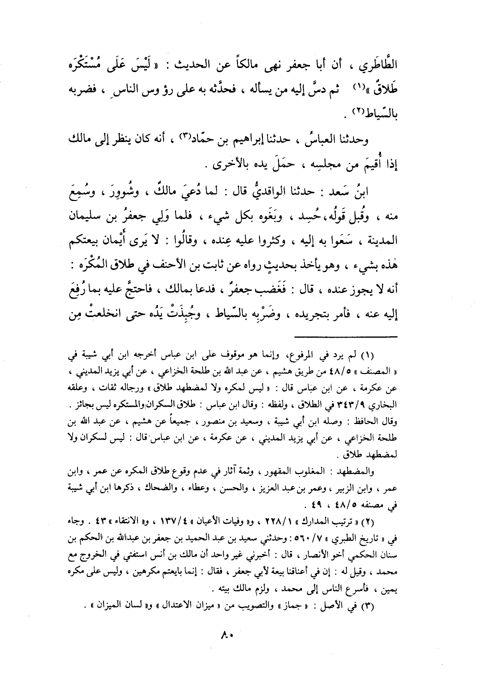 أَنَّ أَبَا جَعْفَرٍ نَهَى مَالِكاً عَنِ الحَدِيْثِ: (لَيْسَ عَلَى مُسْتَكْرَهٍ طَلاَقٌ (1)) ، ثُمَّ دَسَّ إِلَيْهِ مَنْ يَسْأَلُهُ، فَحَدَّثَهُ بِهِ عَلَى رُؤُوْسِ النَّاسِ، فَضَرَبَهُ بِالسِّيَاطِ (2) .