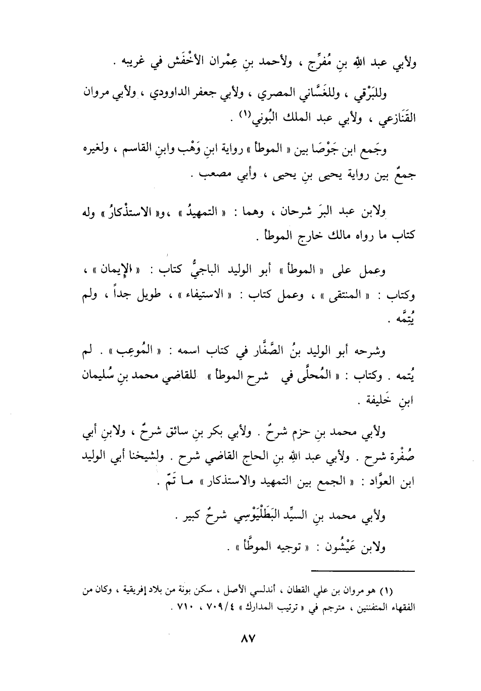 وَلِلْبَرْقِيِّ، وَلِلْغَسَّانِيِّ المِصْرِيِّ، وَلأَبِي جَعْفَرٍ الدَّاوُوْدِيِّ، وَلأَبِي مَرْوَانَ القَنَازِعِيِّ، وَلأَبِي عَبْدِ المَلِكِ البُوْنِيِّ (1) .