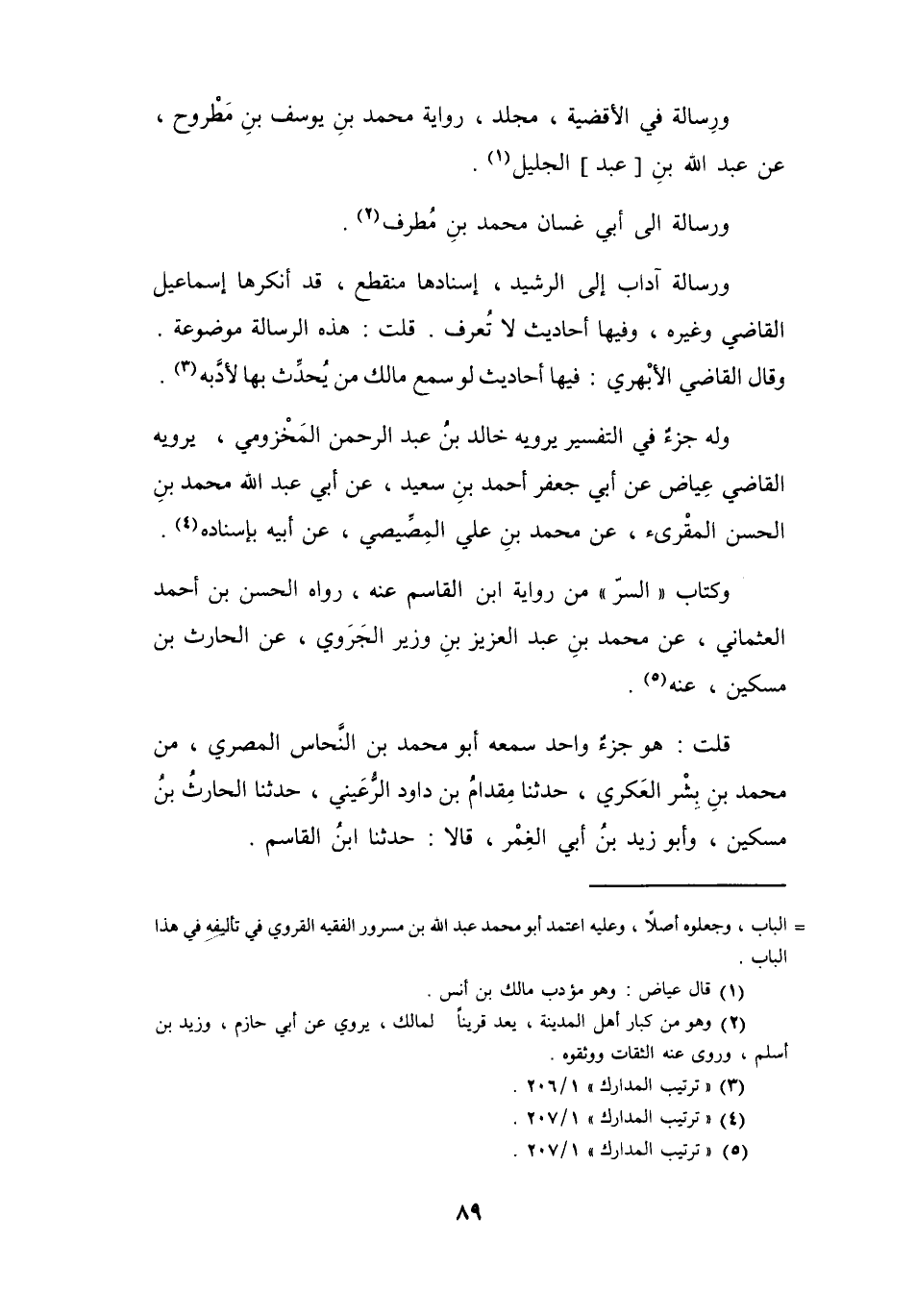قُلْتُ: هُوَ جُزْءٌ وَاحِدٌ، سَمِعَهُ أَبُو مُحَمَّدٍ بنُ النَّحَّاسِ المِصْرِيُّ، مِنْ مُحَمَّدِ بنِ بِشْرٍ العَكرِيِّ، حَدَّثَنَا مِقْدَامُ بنُ دَاوُدَ الرُّعَيْنِيُّ، حَدَّثَنَا الحَارِثُ بنُ مِسْكِيْنٍ، وَأَبُو زَيْدٍ بنُ أَبِي الغِمْرِ، قَالاَ: حَدَّثَنَا ابْنُ القَاسِمِ.
