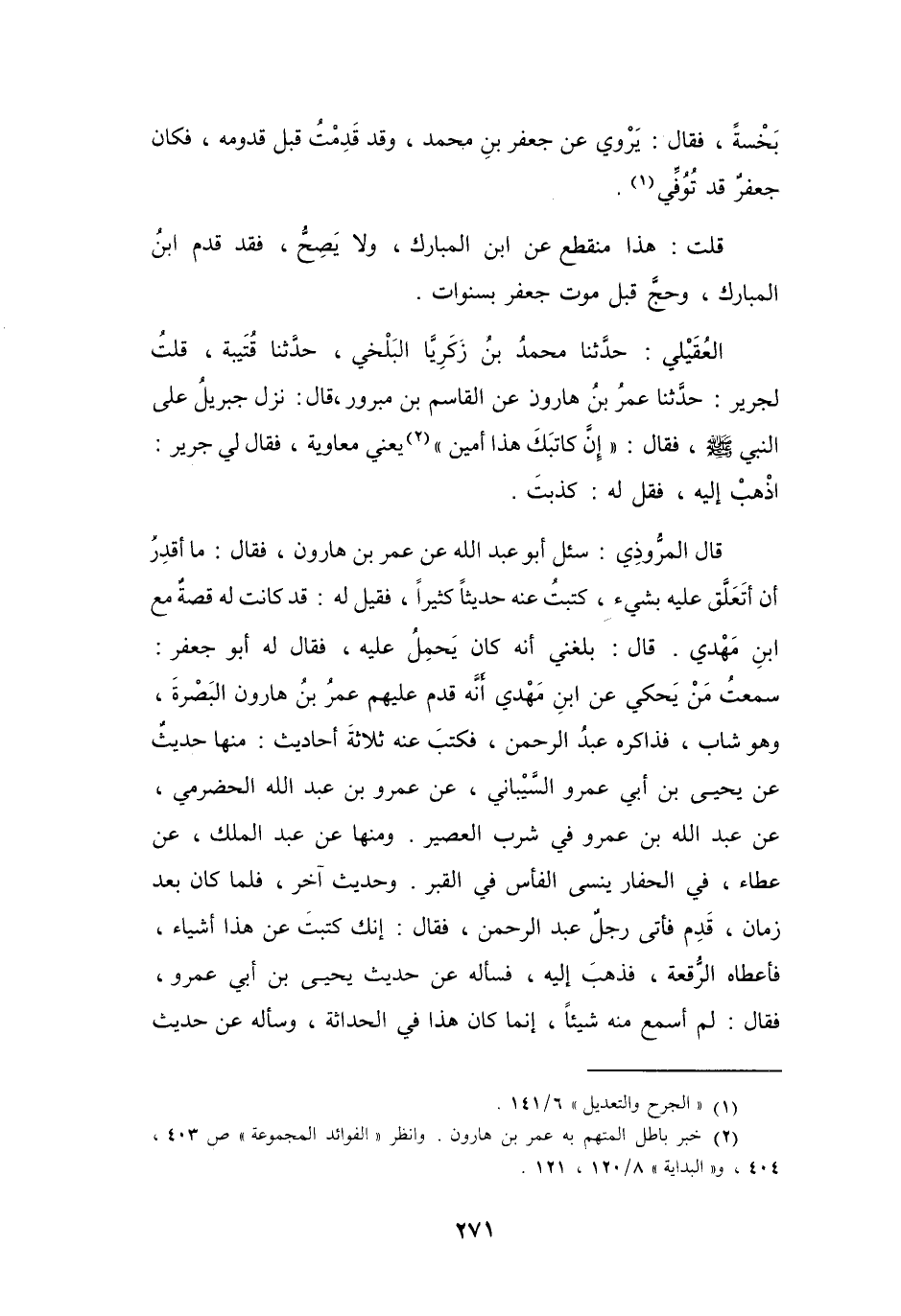 قُلْتُ: هَذَا مُنْقَطِعٌ عَنِ ابْنِ المُبَارَكِ، وَلاَ يَصِحُّ، فَقَدْ قَدِمَ ابْنُ المُبَارَكِ وَحَجَّ قَبْلَ مَوْتِ جَعْفَرٍ بِسَنَوَاتٍ.