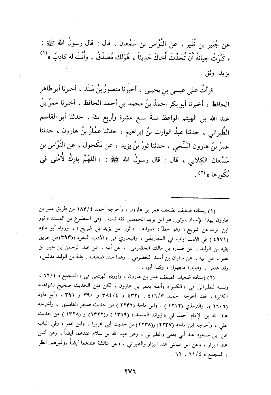قَرَأْتُ عَلَى عِيْسَى بنِ يَحْيَى، أَخْبَرَنَا مَنْصُوْرُ بنُ سَنَدٍ، أَخْبَرَنَا أَبُو طَاهِرٍ الحَافِظُ، أَخْبَرَنَا أَبُو بَكْرٍ أَحْمَدُ بنُ مُحَمَّدِ بنِ أَحْمَدَ الحَافِظُ، أَخْبَرَنَا عُمَرُ بنُ عَبْدِ اللهِ بنِ الهَيْثَمِ الوَاعِظُ سَنَةَ سَبْعَ عَشْرَةَ وَأَرْبَعِ مائَةٍ، حَدَّثَنَا أَبُو القَاسِمِ الطَّبَرَانِيُّ، حَدَّثَنَا عَبْدُ الوَارِثِ بنُ إِبْرَاهِيْمَ، حَدَّثَنَا عَمَّارُ بنُ هَارُوْنَ، حَدَّثَنَا عُمَرُ بنُ هَارُوْنَ البَلْخِيُّ، حَدَّثَنَا ثَوْرُ بنُ يَزِيْدَ، عَنْ مَكْحُوْلٍ، عَنِ النَّوَّاسِ بنِ سَمْعَانَ الكِلاَبِيِّ، قَالَ: قَالَ رَسُوْلُ اللهِ -صَلَّى اللَّهُ عَلَيْهِ وَسَلَّمَ-: (اللَّهُمَّ بَارِكْ لأُمَّتِي فِي بُكُوْرِهَا) (2) .