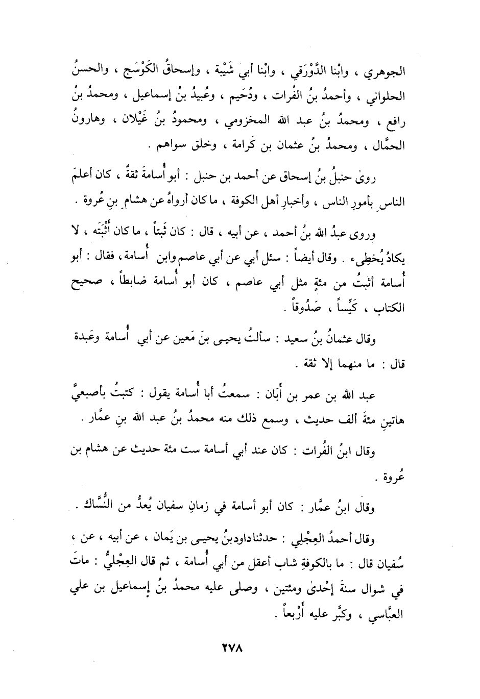أَبُو أُسَامَةَ ثِقَةٌ، كَانَ أَعْلَمَ النَّاسِ بِأُمُوْرِ النَّاسِ، وَأَخْبَارِ أَهْلِ الكُوْفَةِ، مَا كَانَ أَرْوَاهُ عَنْ هِشَامِ بنِ عُرْوَةَ.
