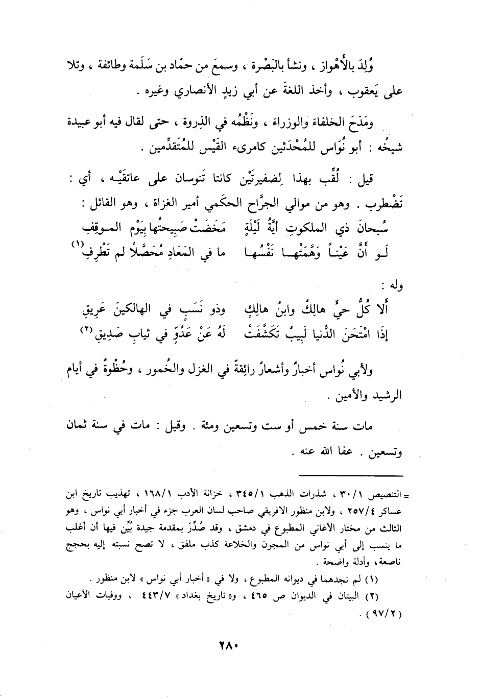 = التنصيص 1 / 30، شذرات الذهب 1 / 345، خزانة الأدب 1 / 168، تهذيب تاريخ ابن عساكر 4 / 257، ولابن منظور الافريقي صاحب لسان العرب جزء في أخبار أبي نواس، هو الثالث من مختار الاغاني المطبوع في دمشق، وقد صدر بمقدمة جيدة بين فيها أن أغلب ما ينسب إلى أبي نواس من المجون والخلاعة كذب ملفق، لا تصح نسبته إليه بحجج ناصعة، وأدلة واضحة.
