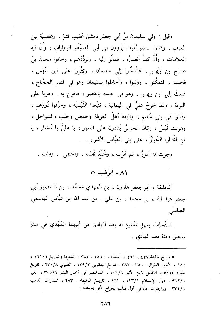 (*) تاريخ خليفة 437، 461، المعارف: 381، 383، المعرفة والتاريخ 1 / 161، 182، الاخبار الطوال: 386، 387، تاريخ اليعقوبي 3 / 139، الطبري 8 / 230، تاريخ بغداد 14 / 5، الكامل لابن الأثير 6 / 106، المختصر في أخبار البشر 1 / 305، العبر 1 / 312، دول الإسلام 1 / 113، 121، تاريخ الخلفاء: 283، شذرات الذهب 1 / 334.