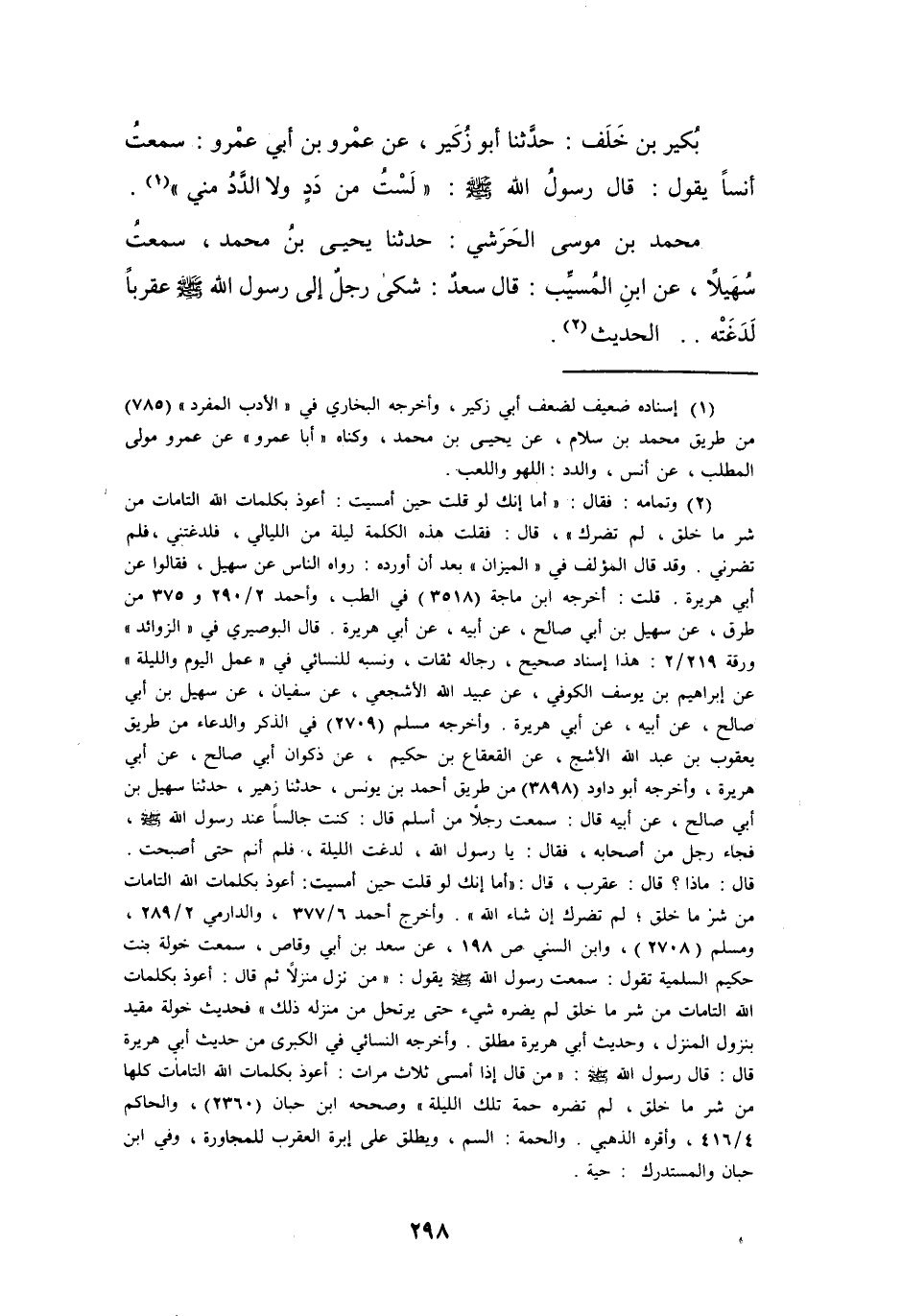 وأخرجه النسائي في الكبرى من حديث أبي هريرة قال: قال رسول الله صلى الله عليه وسلم: " من قال إذا أمسى ثلاث مرات: أعوذ بكلمات الله التامات كلها من شر ما خلق، لم تضره حمة تلك الليلة " وصححه ابن حبان (2360) ، والحاكم 4 / 416، وأقره الذهبي.