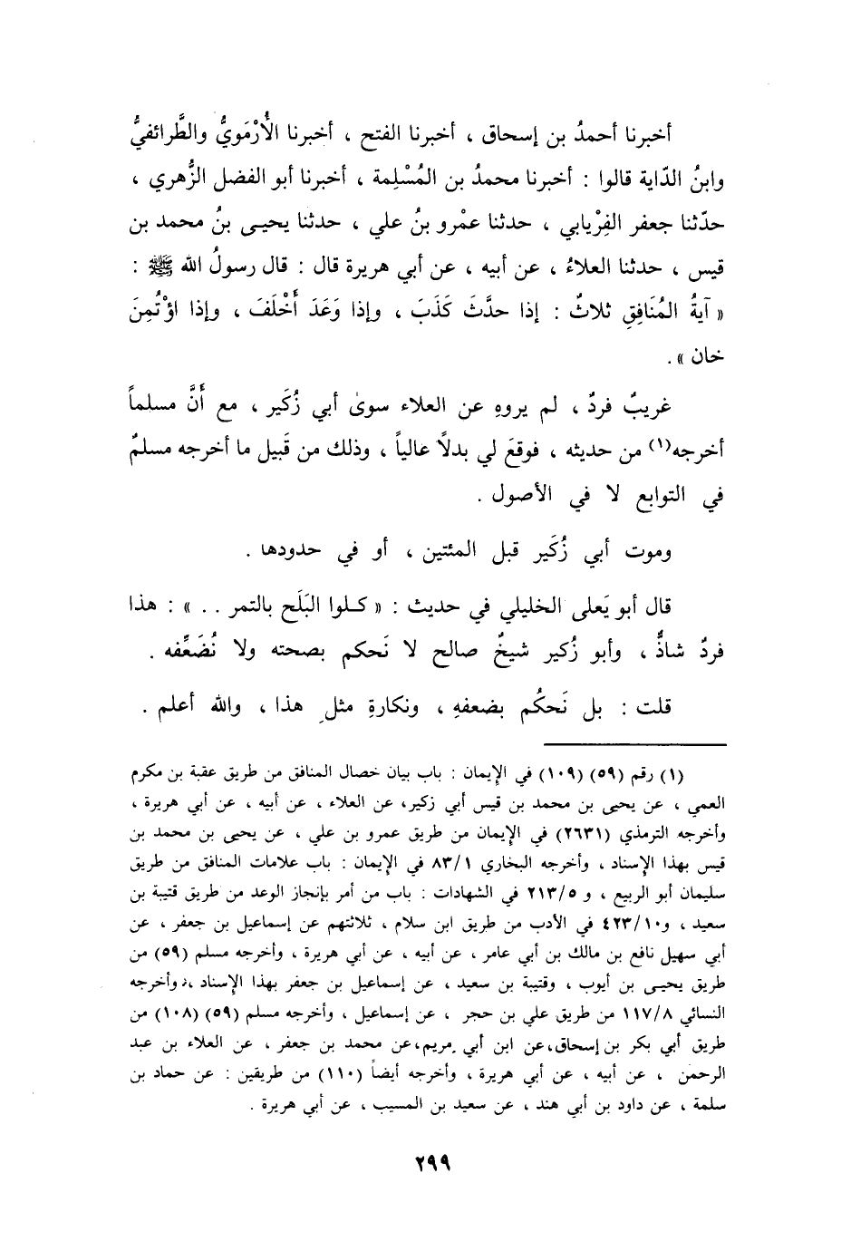 (1) رقم (59) (109) في الايمان: باب بيان خصال المنافق من طريق عقبة بن مكرم العمي، عن يحيى بن محمد بن قيس أبي زكير، عن العلاء، عن أبيه، عن أبي هريرة، وأخرجه الترمذي (2631) في الايمان من طريق عمرو بن علي، عن يحيى بن محمد بن قيس بهذا الإسناد، وأخرجه البخاري 1 / 83 في الايمان: باب علامات المنافق من طريق سليمان أبو الربيع، و5 / 213 في الشهادات: باب من أمر بإنجاز الوعد من طريق قتيبة بن سعيد، و10 / 423 في الأدب من طريق ابن سلام، ثلاثتهم عن إسماعيل بن جعفر، عن أبي سهيل نافع بن مالك بن أبي عامر، عن أبيه، عن أبي هريرة، وأخرجه مسلم (59) من طريق يحيى بن أيوب، وقتيبة بن سعيد، عن إسماعيل بن جعفر بهذا الإسناد، وأخرجه النسائي 8 / 117 من طريق علي بن حجر، عن إسماعيل، وأخرجه مسلم (59) (108) من طريق أبي بكر بن إسحاق، عن ابن أبي مريم، عن محمد بن جعفر، عن العلاء بن عبد الرحمن، عن أبيه، عن أبي هريرة، وأخرجه أيضا (110) من طريقين: عن حماد بن سلمة، عن داود بن أبي هند، عن سعيد بن المسيب، عن أبي هريرة.