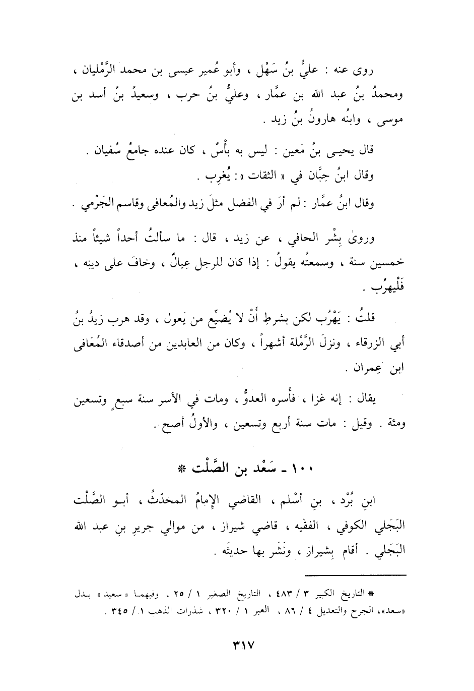 (*) التاريخ الكبير 3 / 483، التاريخ الصغير 1 / 25، وفيهما " سعيد " بدل " سعد "، الجرح والتعديل 4 / 86، العبر 1 / 320، شذرات الذهب 1 / 345.