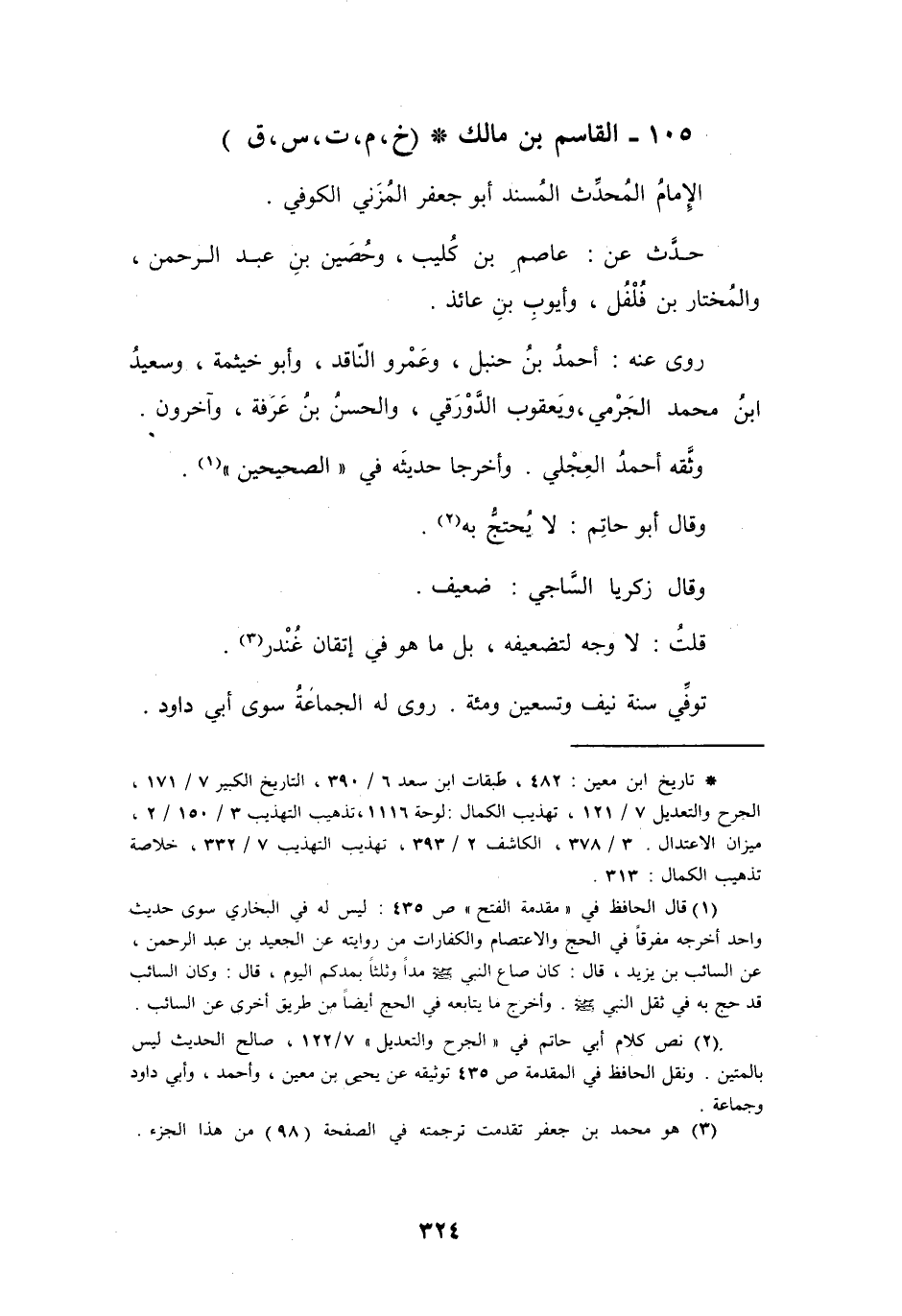 (*) تاريخ ابن معين: 482، طبقات ابن سعد 6 / 390، التاريخ الكبير 7 / 171، الجرح والتعديل 7 / 121، تهذيب الكمال: لوحة 1116، تذهيب التهذيب 3 / 150 / 2. ميزان الاعتدال 3 / 378، الكاشف 2 / 393، تهذيب التهذيب 7 / 332، خلاصة تذهيب الكمال: 313.