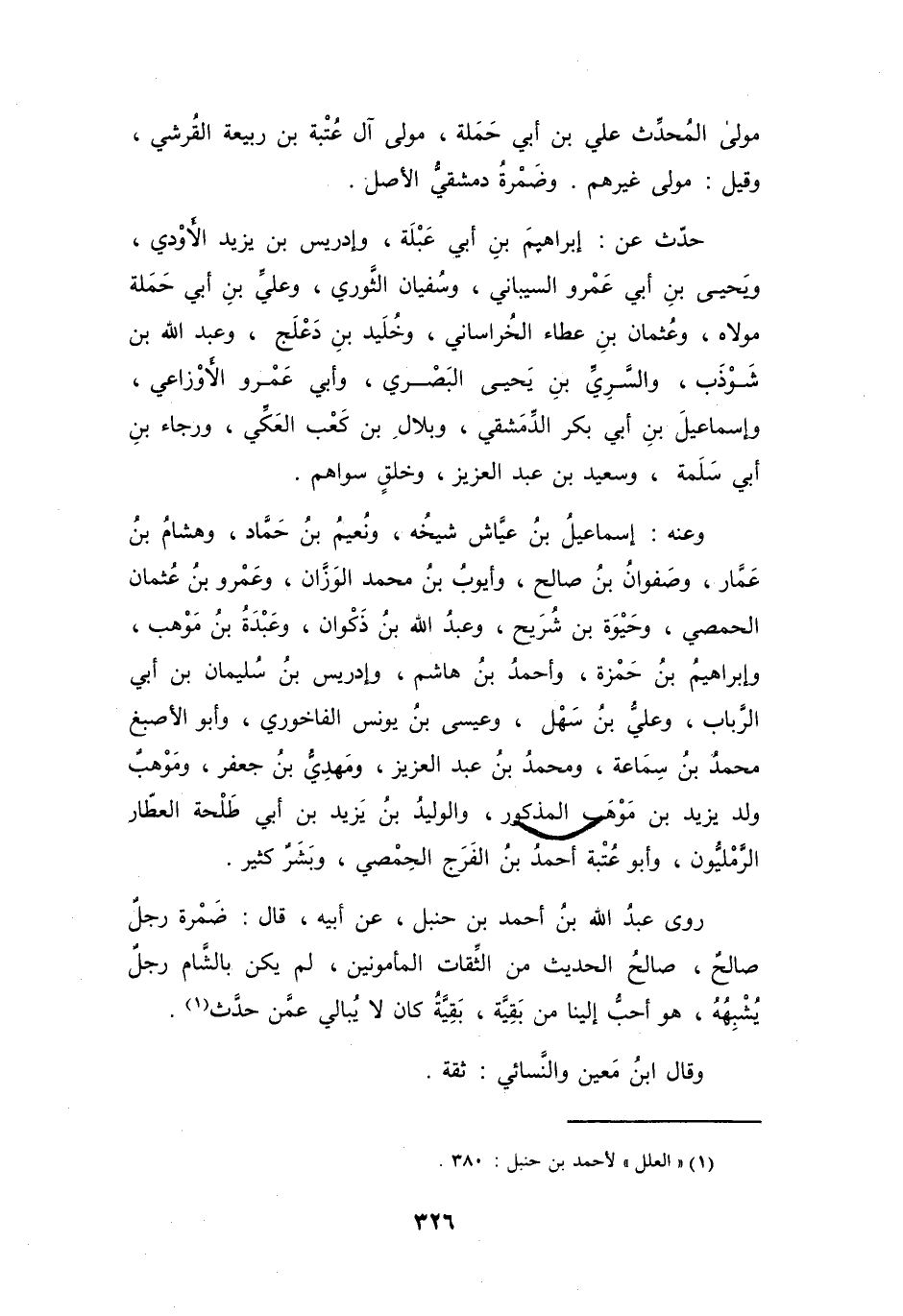 ضَمْرَةُ رَجُلٌ صَالِحٌ، صَالِحُ الحَدِيْثِ مِنَ الثِّقَاتِ المَأْمُوْنِيْنَ، لَمْ يَكُنْ بِالشَّامِ رَجُلٌ يُشْبِهُهُ، هُوَ أَحَبُّ إِلَيْنَا مِنْ بَقِيَّةَ، بَقِيَّةُ كَانَ لاَ يُبَالِي عَمَّنْ حَدَّثَ (1) .