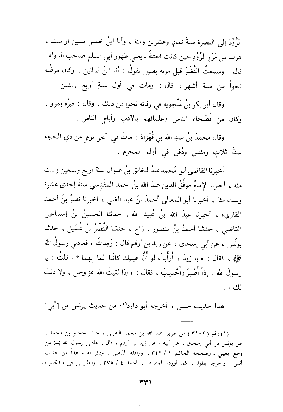 أَخْبَرَنَا القَاضِي أَبُو مُحَمَّدٍ عَبْدُ الخَالِقِ بنُ عُلْوَانَ سَنَةَ أَرْبَعٍ وَتِسْعِيْنَ وَسِتِّ مائَةٍ، أَخْبَرَنَا الإِمَامُ مُوَفَّقُ الدِّيْنِ عَبْدُ اللهِ بنُ أَحْمَدَ المَقْدِسِيُّ سَنَةَ إِحْدَى عَشْرَةَ وَسِتِّ مائَةٍ، أَخْبَرَنَا أَبُو المَعَالِي أَحْمَدُ بنُ عَبْدِ الغَنِيِّ، أَخْبَرَنَا نَصْرُ بنُ أَحْمَدَ القَارِئُ، أَخْبَرَنَا عَبْدُ اللهِ بنُ عُبَيْدِ اللهِ، حَدَّثَنَا الحُسَيْنُ بنُ إِسْمَاعِيْلَ القَاضِي، حَدَّثَنَا أَحْمَدُ بنُ مَنْصُوْرٍ زَاجُ، حَدَّثَنَا النَّضْرُ بنُ شُمَيْلٍ، حَدَّثَنَا يُوْنُسُ، عَنْ أَبِي إِسْحَاقَ، عَنْ زَيْدِ بنِ أَرْقَمَ، قَالَ: