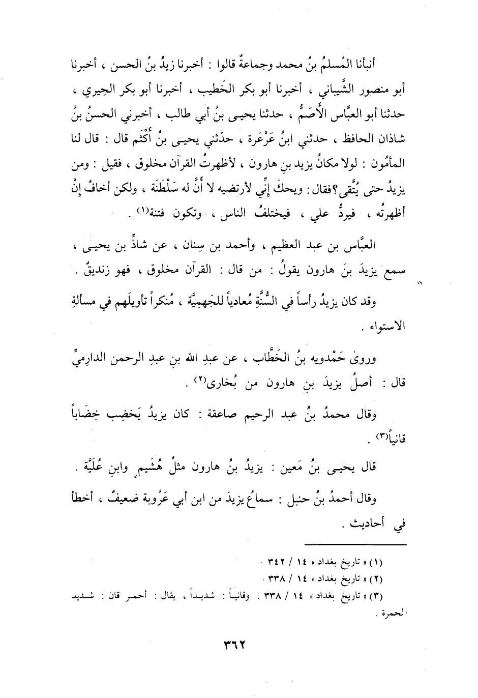 قَالَ لَنَا المَأْمُوْنُ: لَوْلاَ مَكَانُ يَزِيْدَ بنِ هَارُوْنَ، لأَظْهَرتُ القُرْآنَ مَخْلُوْقٌ.