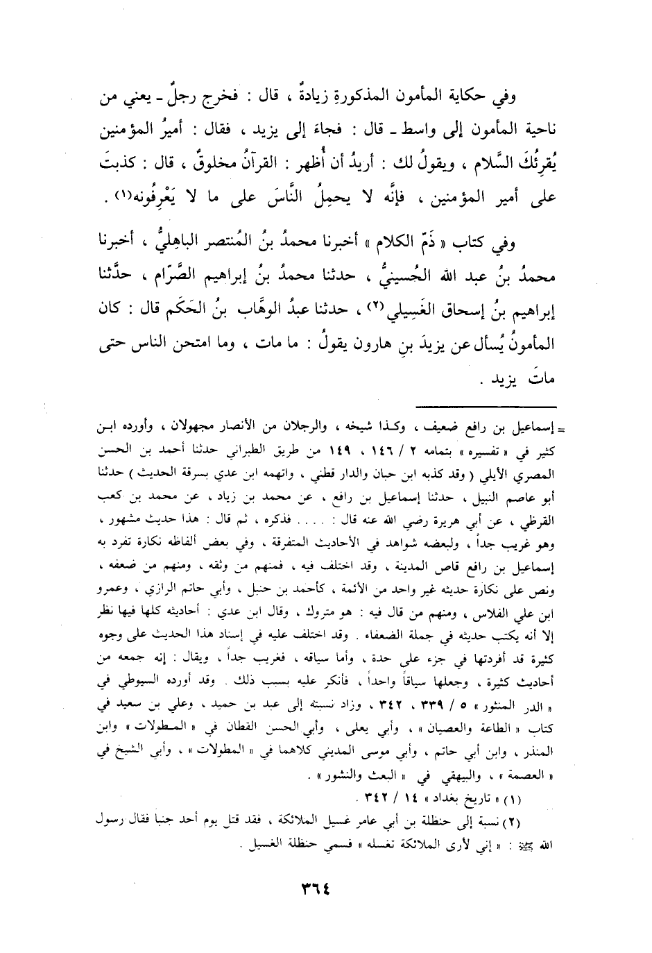 وَفِي كِتَابِ (ذَمِّ الكَلاَمِ) : أَخْبَرَنَا مُحَمَّدُ بنُ المُنْتَصِرِ البَاهِلِيُّ، أَخْبَرَنَا مُحَمَّدُ بنُ عَبْدِ اللهِ الحُسَيْنِيُّ، حَدَّثَنَا مُحَمَّدُ بنُ إِبْرَاهِيْمَ الصَّرَّامُ، حَدَّثَنَا إِبْرَاهِيْمُ بنُ إِسْحَاقَ الغَسِيْلِيُّ (2) ، حَدَّثَنَا عَبْدُ الوَهَّابِ بنُ الحَكَمِ، قَالَ: