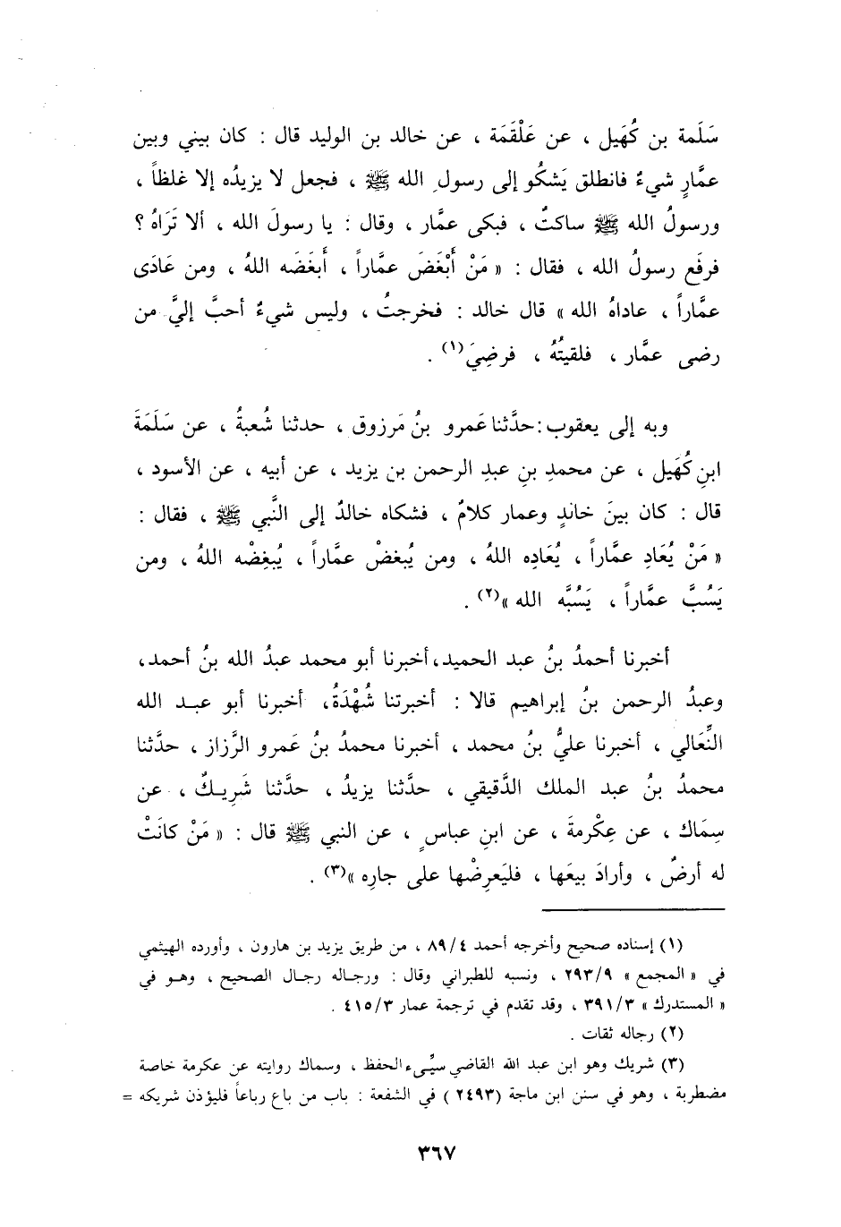 كَانَ بَيْنَ خَالِدٍ وَعَمَّارٍ كَلاَمٌ، فَشَكَاهُ خَالِدٌ إِلَى النَّبِيِّ -صَلَّى اللَّهُ عَلَيْهِ وَسَلَّمَ- فَقَالَ: (مَنْ يُعَادِ عَمَّاراً، يُعَادِهِ اللهُ، وَمَنْ يُبْغِضْ عَمَّاراً، يُبْغِضْهُ اللهُ، وَمَنْ يَسُبَّ عَمَّاراً، يَسُبَّهُ اللهُ) (2) .