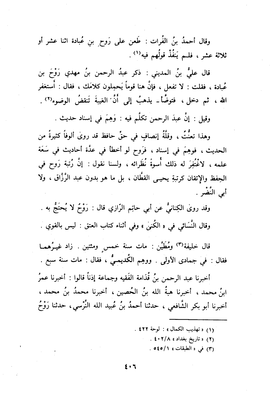 وَهَذَا تَعَنُّتٌ، وَقِلَّةُ إِنصَافٍ فِي حَقِّ حَافِظٍ قَدْ رَوَى أُلُوْفاً كَثِيْرَةً مِنَ الحَدِيْثِ، فَوَهِمَ فِي إِسْنَادٍ، فَرَوْحٌ لَوْ أَخْطَأَ فِي عِدَّةِ أَحَادِيْثَ فِي سَعَةِ عِلْمِهِ، لاَغْتُفِرَ لَهُ ذَلِكَ أُسْوَةُ نُظَرَائِهِ، وَلَسْنَا نَقُوْلُ: إِنَّ رُتْبَةَ رَوْحٍ فِي الحِفْظِ وَالإِتْقَانِ كَرُتْبَةِ يَحْيَى القَطَّانِ، بَلْ مَا هُوَ بِدُوْنِ عَبْدِ الرَّزَّاقِ، وَلاَ أَبِي النَّضْرِ.