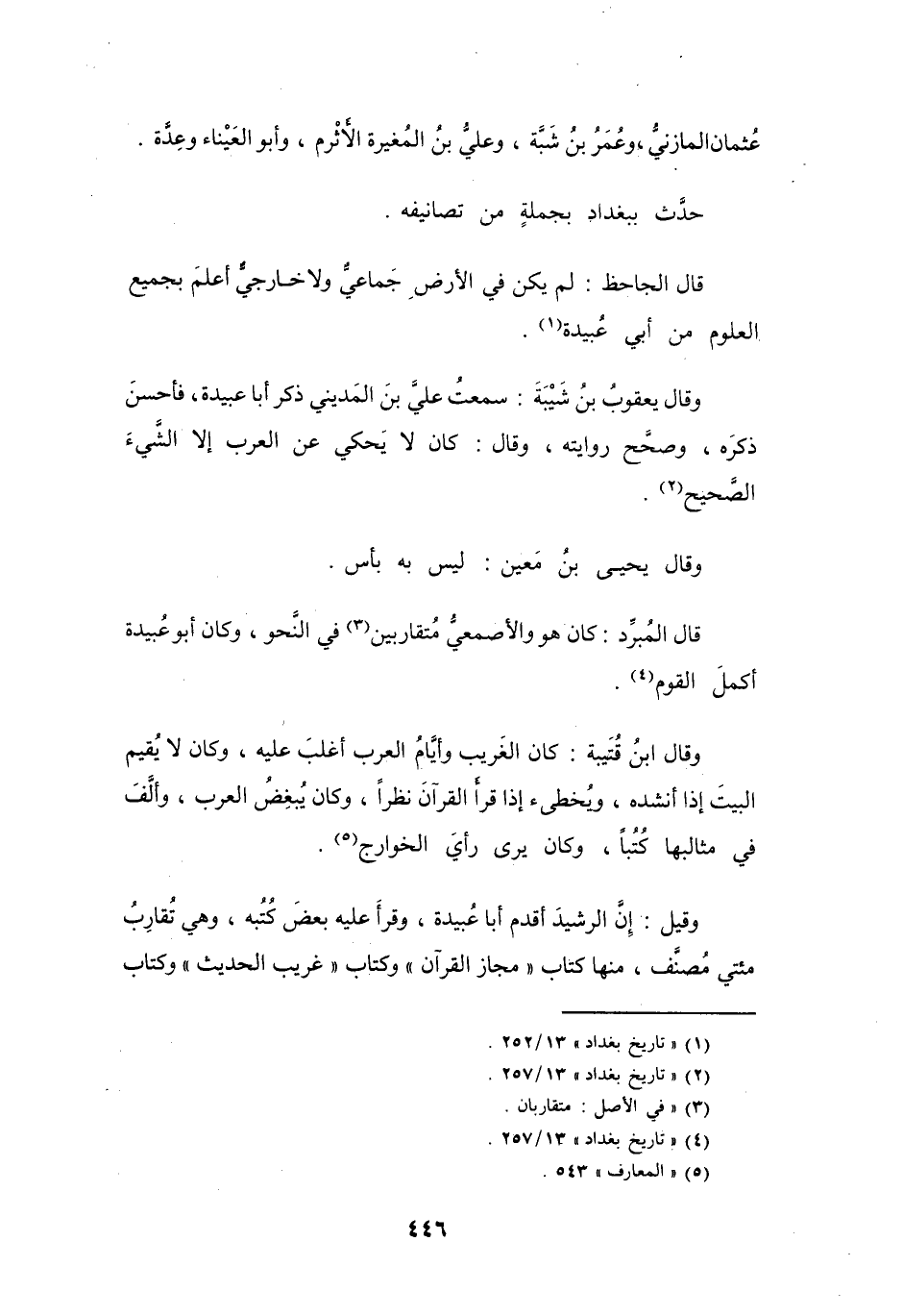 قَالَ الجَاحِظُ: لَمْ يَكُنْ فِي الأَرْضِ جَمَاعِيٌّ وَلاَ خَارِجِيٌّ أَعْلَمَ بِجَمِيْعِ العُلُوْمِ مِنْ أَبِي عُبَيْدَةَ (1) .