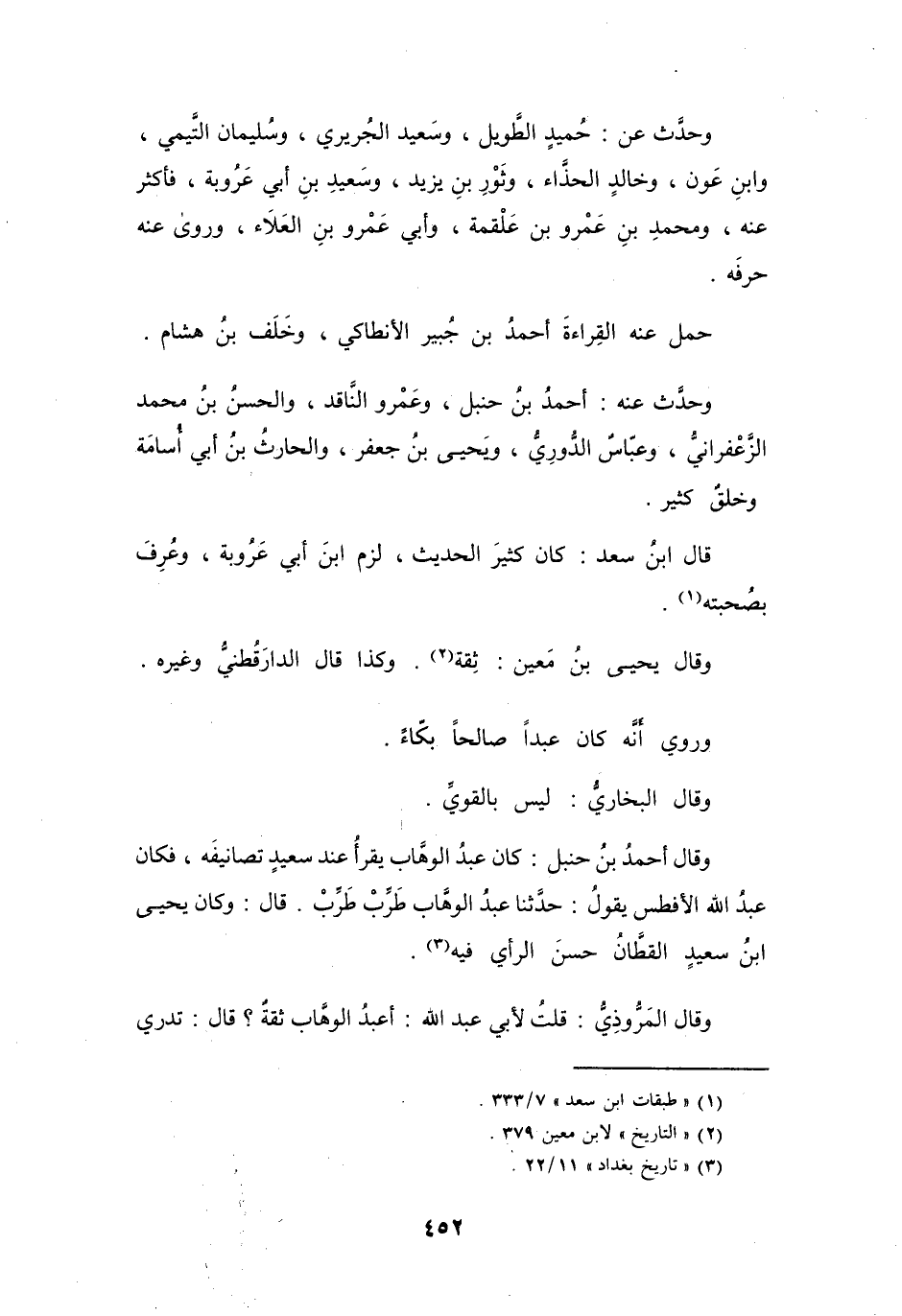 وَقَالَ أَحْمَدُ بنُ حَنْبَلٍ: كَانَ عَبْدُ الوَهَّابِ يَقرَأُ عِنْدَ سَعِيْدٍ تَصَانِيْفَهُ، فَكَانَ عَبْدُ اللهِ الأَفْطَسُ يَقُوْلُ: حَدَّثَنَا عَبْدُ الوَهَّابِ طَرِّبْ طَرِّبْ.