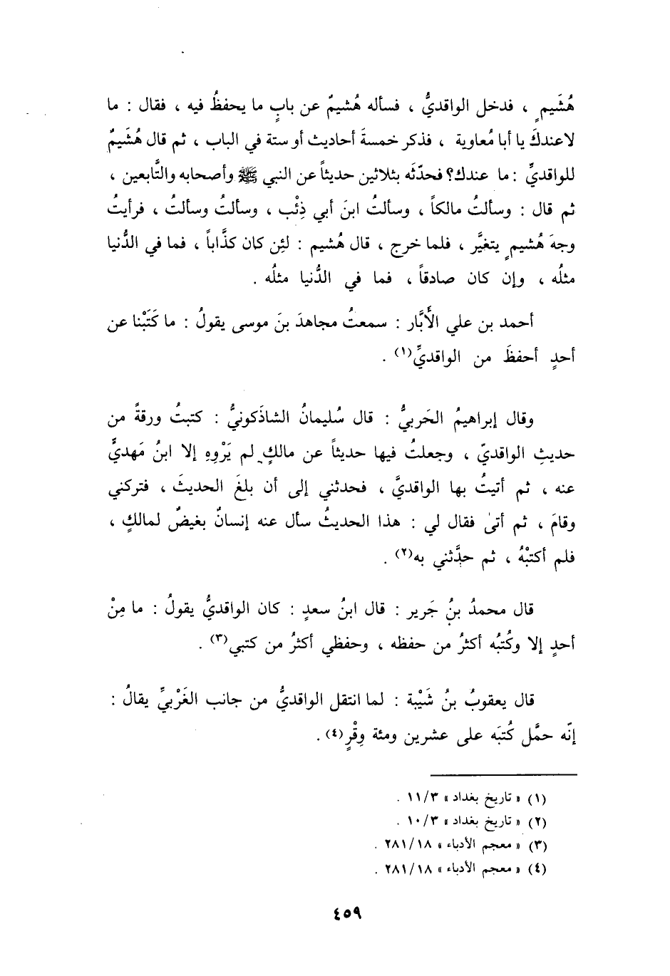 هُشَيْمٍ، فَدَخَلَ الوَاقِدِيُّ، فَسَأَلَهُ هُشَيْمٌ عَنْ بَابٍ: مَا يَحْفَظُ فِيْهِ؟