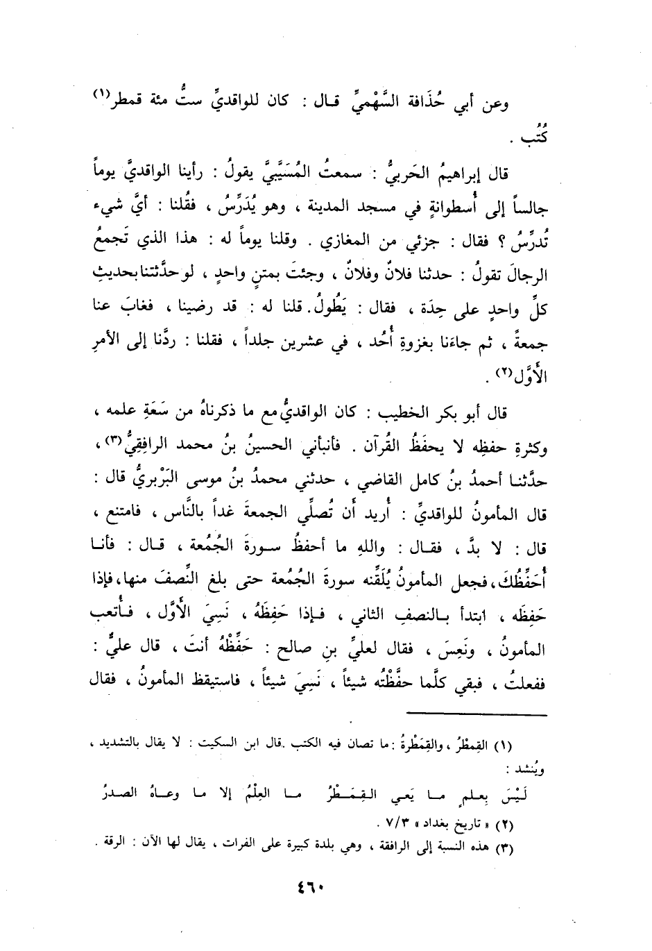 وَعَنْ أَبِي حُذَافَةَ السَّهْمِيِّ، قَالَ: كَانَ لِلْوَاقِدِيِّ سِتُّ مائَةِ قِمَطْرٍ (1) كُتُبٍ.