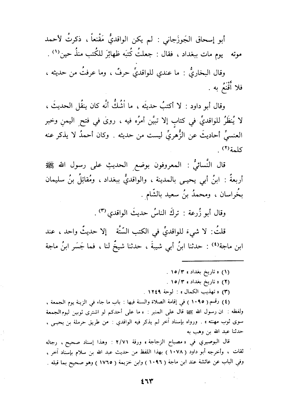 أَبُو إِسْحَاقَ الجَوْزَجَانِيُّ: لَمْ يَكُنِ الوَاقِدِيُّ مَقْنَعاً، ذَكَرتُ لأَحْمَدَ مَوْتَهُ يَوْمَ مَاتَ بِبَغْدَادَ، فَقَالَ: جَعَلتُ كُتُبَهُ ظَهَائِرَ لِلْكُتِبِ مُنْذُ حِيْنَ (1) .