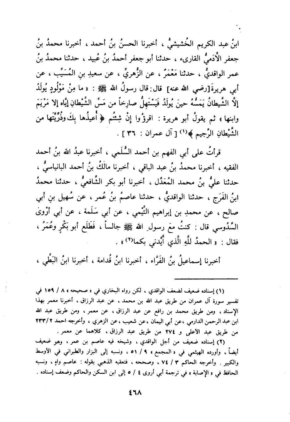 بنُ عَبْدِ الكَرِيْمِ الخُشَيْشِيُّ، أَخْبَرَنَا الحَسَنُ بنُ أَحْمَدَ، أَخْبَرَنَا مُحَمَّدُ بنُ جَعْفَرٍ الأَدَمِيُّ القَارِئُ، حَدَّثَنَا أَبُو جَعْفَرٍ أَحْمَدُ بنُ عُبَيْدٍ، حَدَّثَنَا مُحَمَّدُ بنُ عُمَرَ الوَاقِدِيُّ، حَدَّثَنَا مَعْمَرٌ، عَنِ الزُّهْرِيِّ، عَنْ سَعِيْدِ بنِ المُسَيِّبِ، عَنْ أَبِي هُرَيْرَةَ -رَضِيَ اللهُ عَنْهُ- قَالَ: