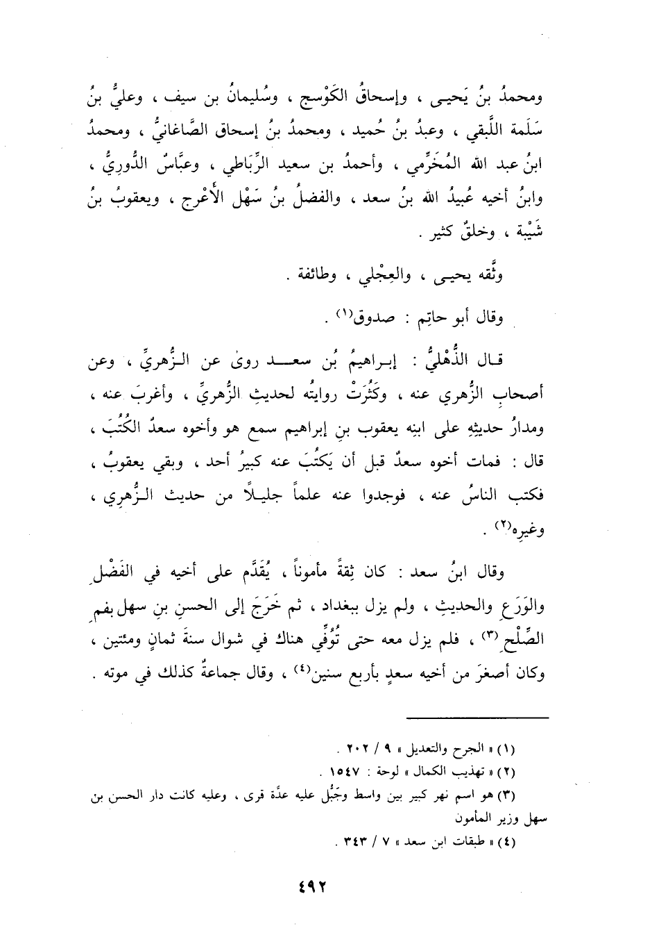 وَقَالَ ابْنُ سَعْدٍ: كَانَ ثِقَةً، مَأْمُوْناً، يُقَدَّمُ عَلَى أَخِيْهِ فِي الفَضْلِ، وَالوَرَعِ، وَالحَدِيْثِ، وَلَمْ يَزَلْ بِبَغْدَادَ، ثُمَّ خَرَجَ إِلَى الحَسَنِ بنِ سَهْلٍ بِفَمِ الصِّلْحِ (3) ، فَلَمْ يَزَلْ مَعَهُ حَتَّى تُوُفِّيَ هُنَاكَ فِي شَوَّالٍ، سَنَةَ ثَمَانٍ وَمائَتَيْنِ، وَكَانَ أَصْغَرَ مِنْ أَخِيْهِ سَعْدٍ بِأَرْبَعِ سِنِيْنَ (4) .