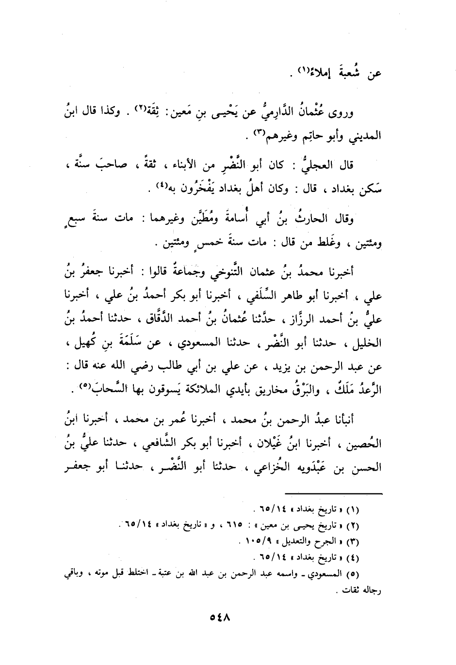 (2) " تاريخ يحيى بن معين ": 615، و" تاريخ بغداد " 14 / 65.