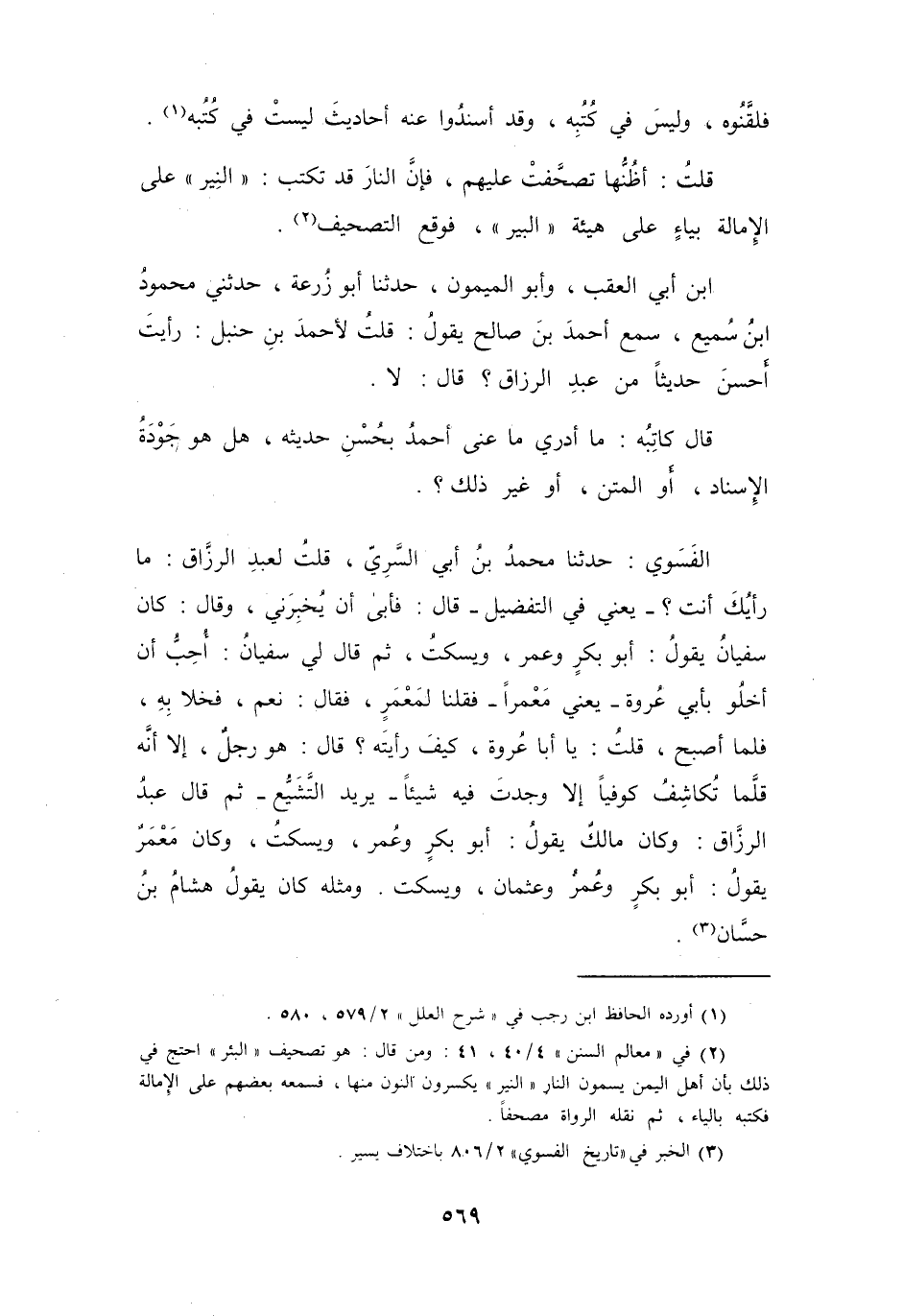 الفَسَوِيُّ: حَدَّثَنَا مُحَمَّدُ بنُ أَبِي السَّرِيِّ، قُلْتُ لِعَبْدِ الرَّزَّاقِ: مَا رَأْيُكَ أَنْتَ؟