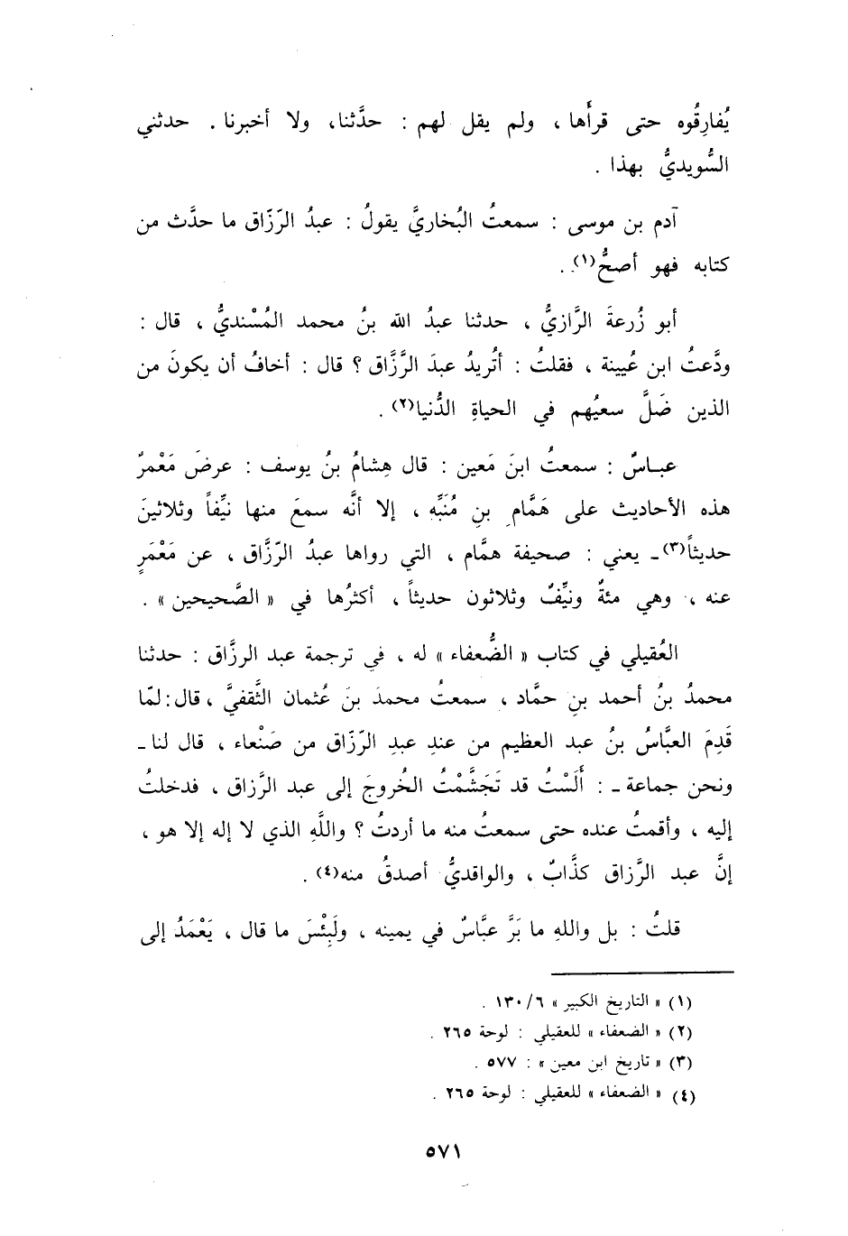 العُقَيْلِيُّ فِي كِتَابِ (الضُّعَفَاءِ) لَهُ، فِي تَرْجَمَةِ عَبْدِ الرَّزَّاقِ: