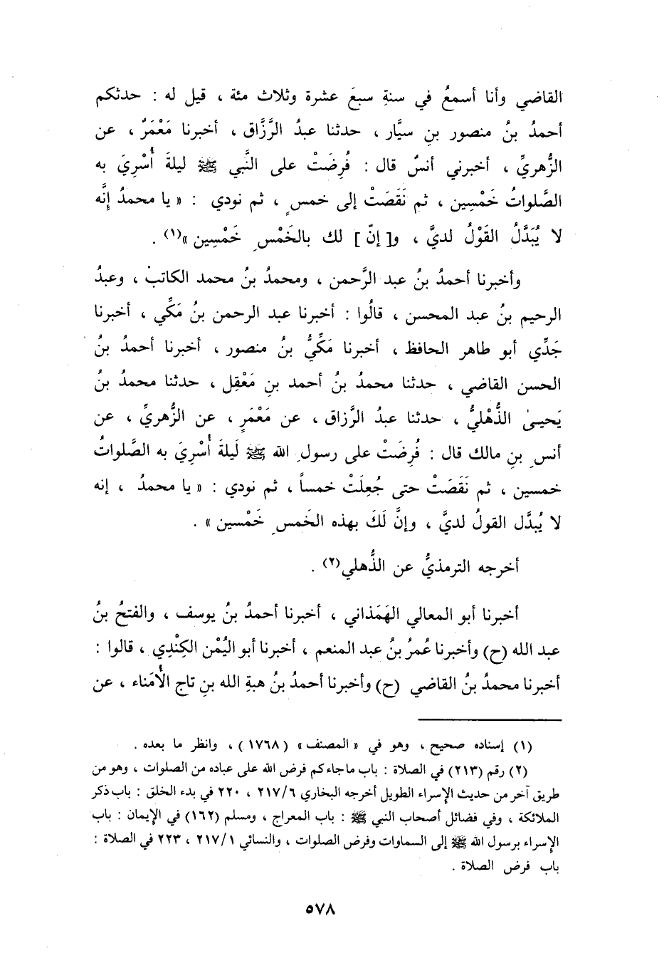فُرِضَتْ عَلَى رَسُوْلِ اللهِ -صَلَّى اللَّهُ عَلَيْهِ وَسَلَّمَ- لَيْلَةَ أُسْرِيَ بِهِ الصَّلَوَاتُ خَمْسِيْنَ، ثُمَّ نَقَصَتْ حَتَّى جُعِلَتْ خَمْساً، ثُمَّ نُودِيَ: (يَا مُحَمَّدُ! إِنَّهُ لاَ يُبَدَّلُ القَوْلُ لَدَيَّ، وَإِنَّ لَكَ بِهَذِهِ الخَمْسِ خَمْسِيْنَ) .