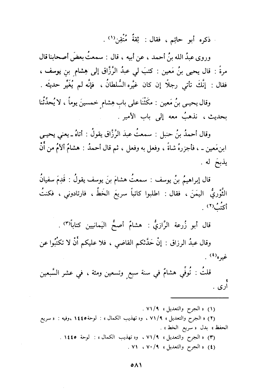 قَالَ أَبُو زُرْعَةَ الرَّازِيُّ: هِشَامٌ أَصَحُّ اليَمَانِيِّيْنِ كِتَاباً (3) .