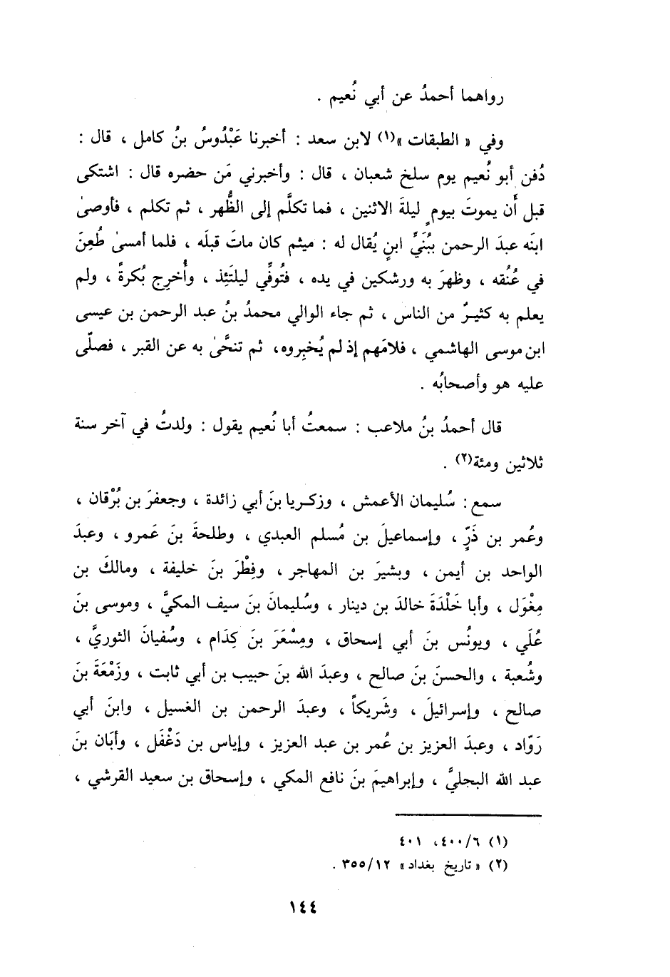 وَفِي (الطَّبَقَاتِ (1)) لابْنِ سَعْدٍ، أَخْبَرَنَا عَبْدُوْسُ بنُ كَامِلٍ، قَالَ: دُفِنَ أَبُو نُعَيْمٍ يَوْمَ سَلْخِ شَعْبَانَ.