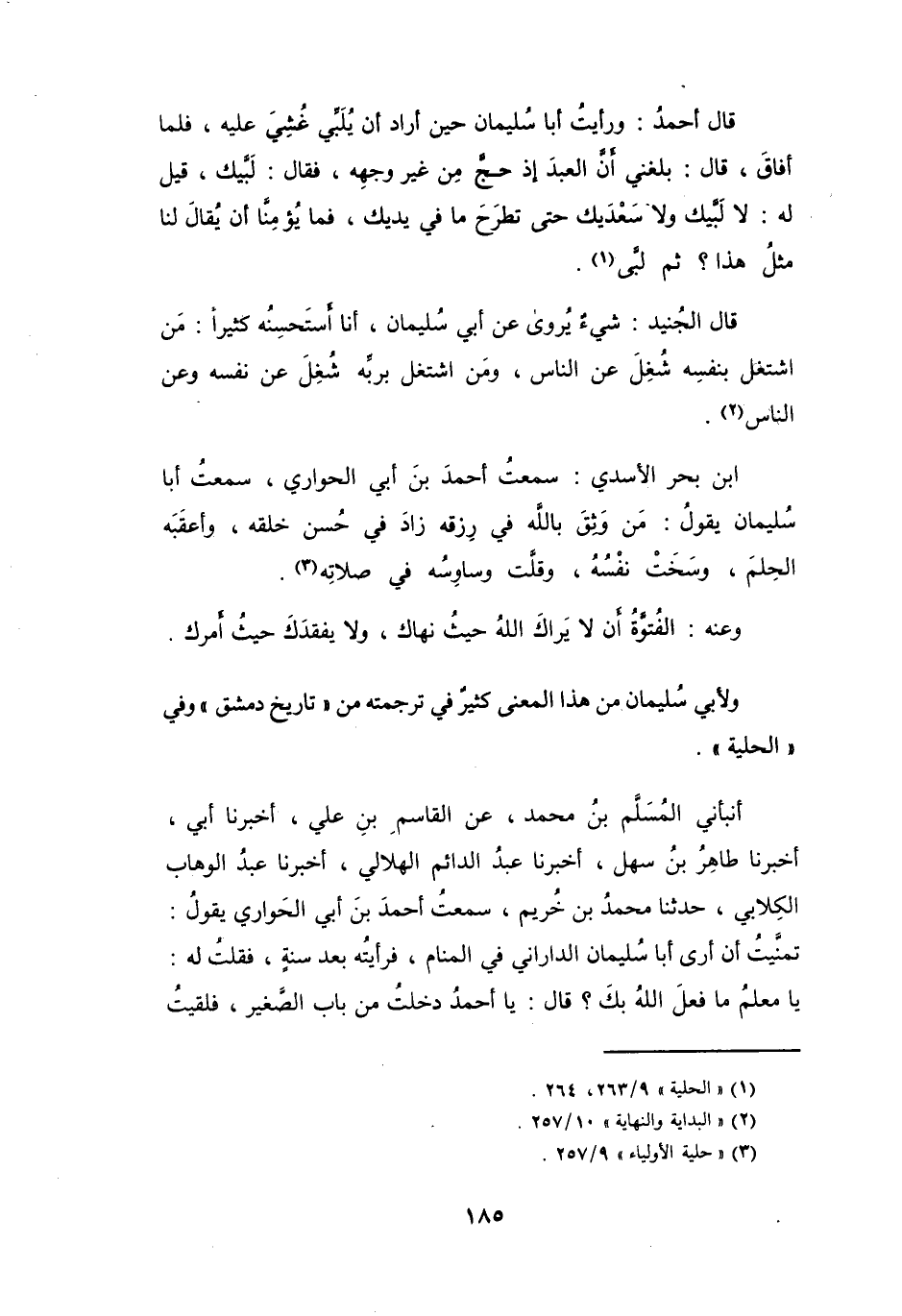 تَمَنَّيْتُ أَنْ أَرَى أَبَا سُلَيْمَانَ الدَّارَانِيَّ فِي المَنَامِ، فَرَأَيْتُهُ بَعْدَ سَنَةٍ، فَقُلْتُ لَهُ: يَا مُعَلِّمُ! مَا فَعَلَ اللهُ بِكَ؟