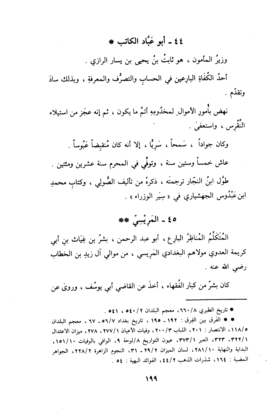 (* *) الفرق بين الفرق: 192 - 195، تاريخ بغداد 7 / 56 - 67، معجم البلدان 5 / 118، الانتصار: 201، اللباب 3 / 200، وفيات الأعيان 1 / 277، 278، ميزان الاعتدال 1 / 322، 323، العبر 1 / 373، عيون التواريخ 8 / لوحة 9، الوافي بالوفيات 10 / 151، البداية والنهاية 10 / 281، لسان الميزان 2 / 29 - 31، النجوم الزاهرة 2 / 228، الجواهر المضية: 164، شذرات الذهب 2 / 44، الفوائد البهية: 54.