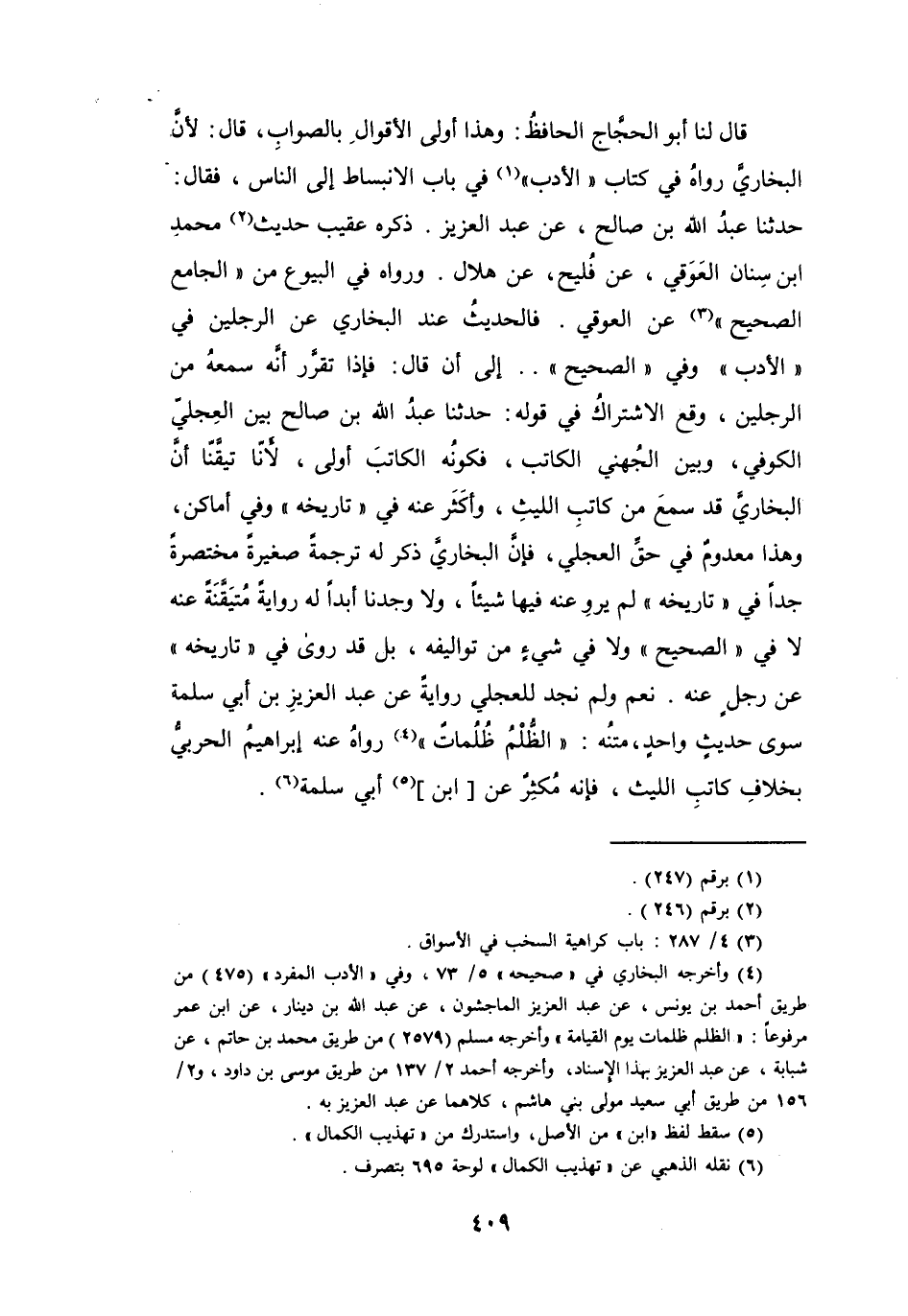 فَإِذَا تَقَرَّرَ أَنَّهُ سَمِعَهُ مِنَ الرَّجُلَيْنِ، وَقَعَ الاشْتِرَاكُ فِي قَوْلِهِ: حَدَّثَنَا عَبْدُ اللهِ بنُ صَالِحٍ بَيْنَ العِجْلِيِّ الكُوْفِيِّ، وَبَيْنَ الجُهَنِيِّ الكَاتِبِ، فَكَوْنُهُ الكَاتِبَ أَوْلَى، لأَنَّا تَيَقَنَّا أَنَّ البُخَارِيَّ قَدْ سَمِعَ مِنْ كَاتِبِ اللَّيْثِ، وَأَكْثَرَ عَنْهُ فِي (تَارِيْخِهِ) ، وَفِي أَمَاكِنَ، وَهَذَا مَعْدُومٌ فِي حَقِّ العِجْلِيِّ، فَإِنَّ البُخَارِيَّ ذَكَرَ لَهُ تَرْجَمَةً صَغِيْرَةً مُخْتَصَرَةً جِدّاً فِي (تَارِيْخِهِ) ، لَمْ يَرْوِ عَنْهُ فِيْهَا شَيْئاً، وَلاَ وَجَدْنَا أَبَداً لَهُ رِوَايَةً مُتَيَقَّنَةً عَنْهُ، لاَ فِي (الصَّحِيْحِ) ، وَلاَ فِي شَيْءٍ مِنْ تَوَالِيْفِهِ، بَلْ قَدْ رَوَى فِي (تَارِيْخِهِ) عَنْ رَجُلٍ عَنْهُ.