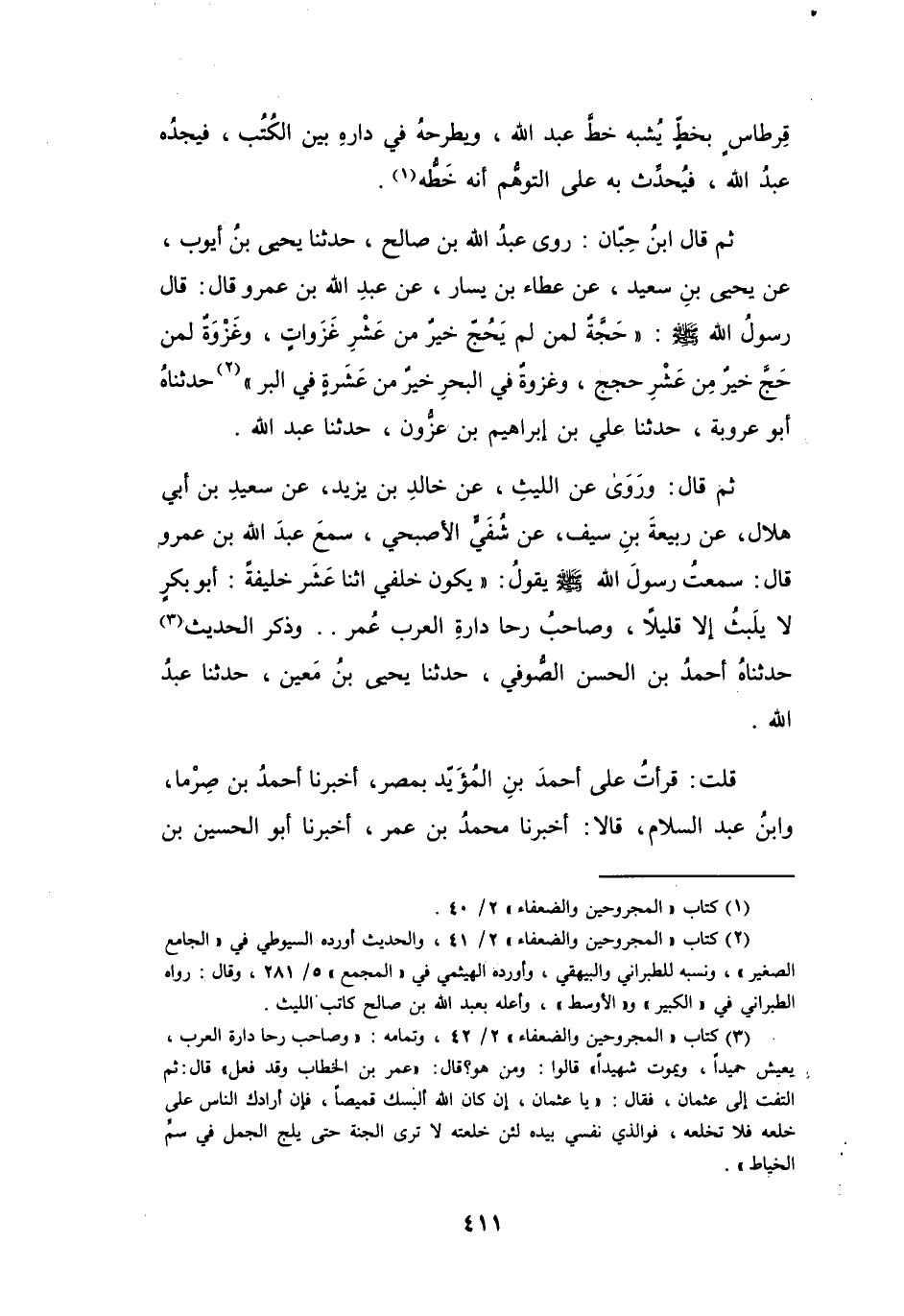 (3) كتاب " المجروحين والضعفاء " 2 / 42، وتمامه: " وصاحب رحا دارة العرب، يعيش حميدا، ويموت شهيدا " قالوا: ومن هو؟ قال: " عمر بن الخطاب وقد فعل " قال: ثم التفت إلى عثمان، فقال: " يا عثمان، إن كان الله ألبسك قميصا، فإن أرادك الناس على خلعه فلا تخلعه، فوالذي نفسي بيده لئن خلعته لا ترى الجنة حتى يلج الجمل في سم الخياط ".