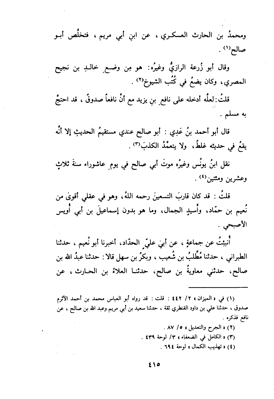 قَالَ أَبُو أَحْمَدَ بنُ عَدِيٍّ: أَبُو صَالِحٍ عِنْدِي مُسْتَقِيْمُ الحَدِيْثِ، إِلاَّ أَنَّهُ يَقَعُ فِي حَدِيْثِهِ غَلَطٌ، وَلاَ يَتَعَمَّدُ الكَذِبَ (3) .