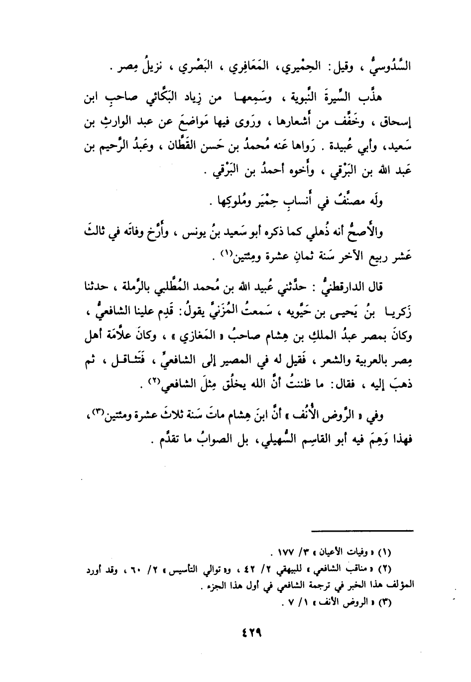 وَفِي (الرَّوْضِ الأُنُفِ) : أَنَّ ابْنَ هِشَامٍ مَاتَ سَنَةَ ثَلاَثَ عَشْرَةَ وَمائَتَيْنِ (3) .