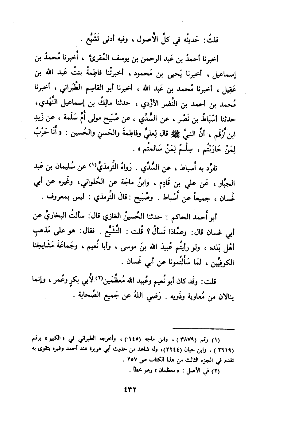 رَوَاهُ: التِّرْمِذِيُّ (1) عَنْ سُلَيْمَانَ بنِ عَبْدِ الجَبَّارِ عَنْ عَلِيِّ بنِ قَادِمٍ، وَابْنُ مَاجَهْ عَنِ الحُلْوَانِيِّ، وَغَيْرُهُ عَنْ أَبِي غَسَّانَ، جَمِيْعاً عَنْ أَسْبَاطٍ.
