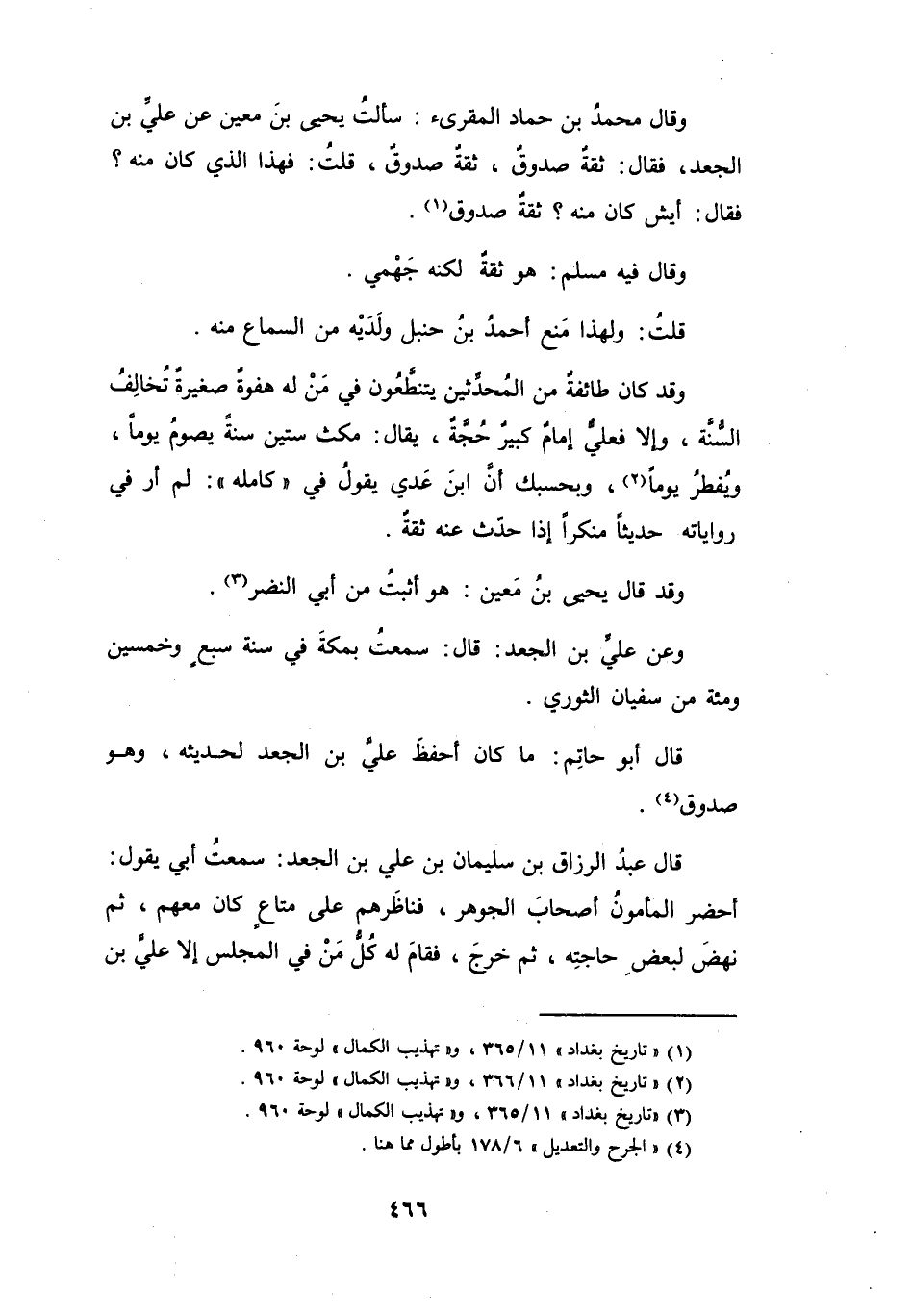 وَقَالَ مُحَمَّدُ بنُ حَمَّادٍ المُقْرِئُ: سَأَلْتُ يَحْيَى بنَ مَعِيْنٍ عَنْ عَلِيِّ بنِ الجَعْدِ، فَقَالَ: ثِقَةٌ صَدُوْقٌ، ثِقَةٌ صَدُوْقٌ.