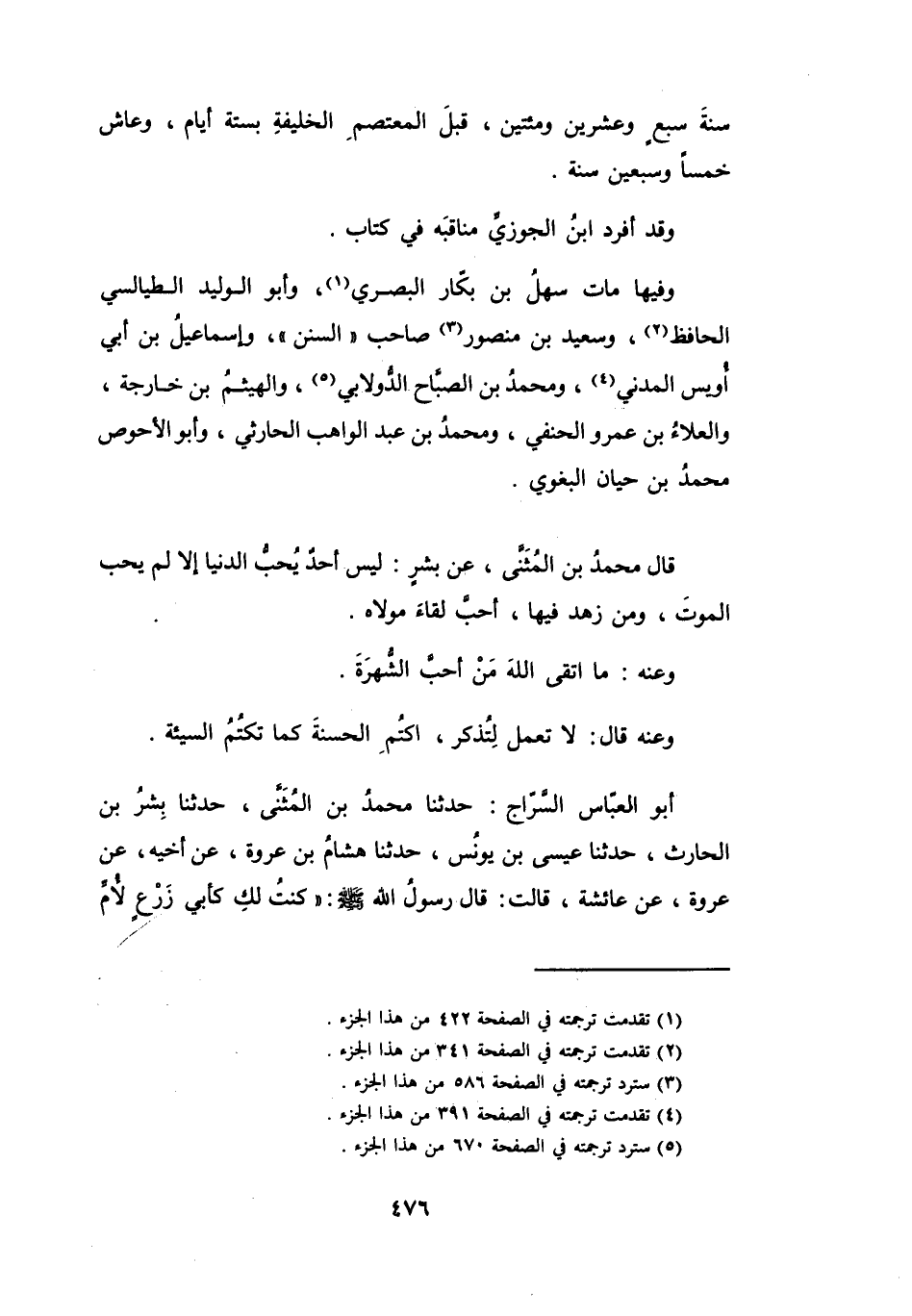 أَبُو العَبَّاسِ السَّرَّاجُ: حَدَّثَنَا مُحَمَّدُ بنُ المُثَنَّى، حَدَّثَنَا بِشْرُ بنُ الحَارِثِ، حَدَّثَنَا عِيْسَى بنُ يُوْنُسَ، حَدَّثَنَا هِشَامُ بنُ عُرْوَةَ، عَنْ أَخِيْهِ، عَنْ عُرْوَةَ، عَنْ عَائِشَةَ، قَالَتْ: