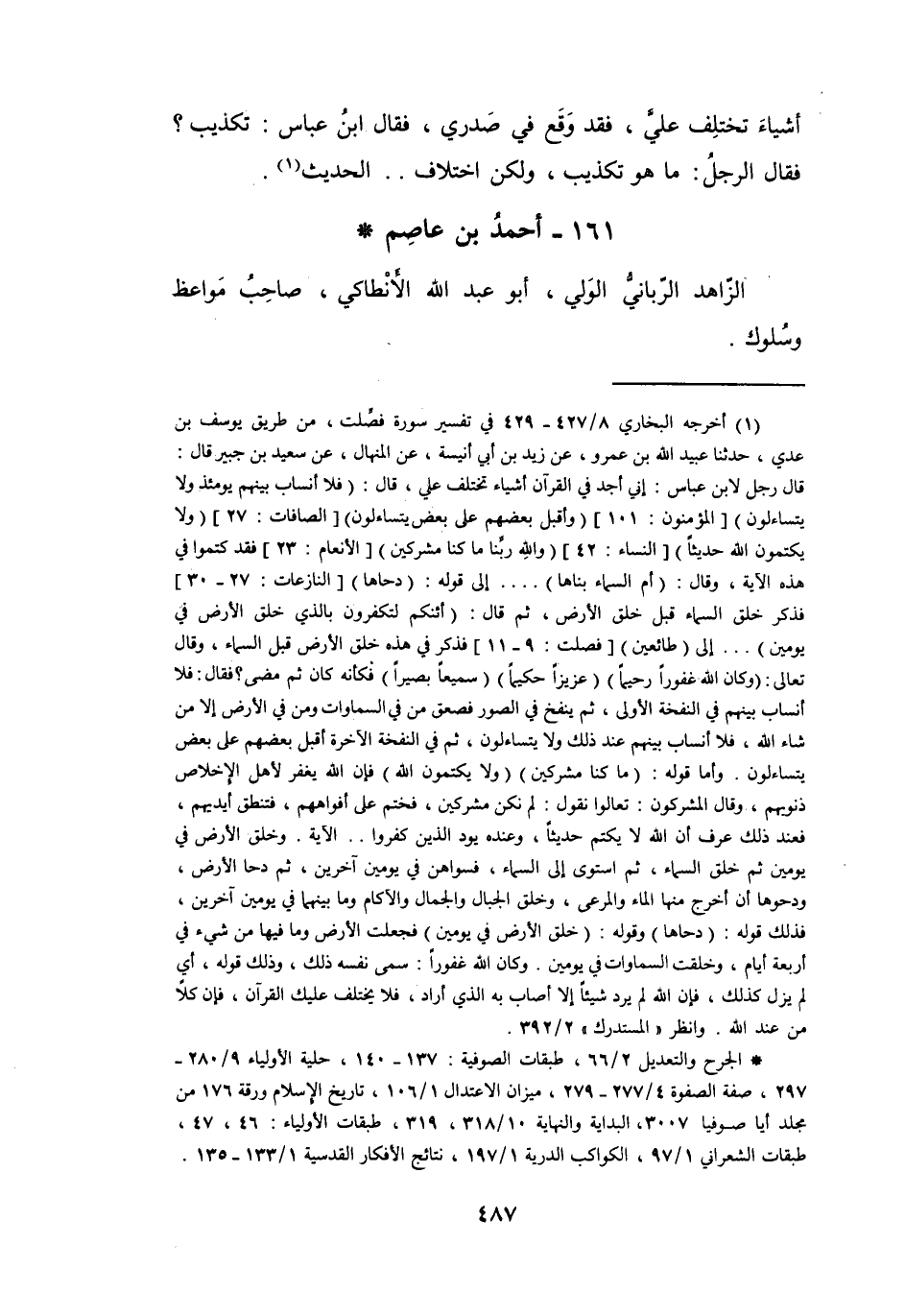 (1) أخرجه البخاري 8 / 427 - 429 في تفسير سورة فصلت، من طريق يوسف بن عدي، حدثنا عبيد الله بن عمرو، عن زيد بن أبي أنيسة، عن المنهال، عن سعيد بن جبير قال: قال رجل لابن عباس: إني أجد في القرآن أشياء تختلف علي، قال: (فلا أنساب بينهم يومئذ ولا يتساءلون) [المؤمنون: 101] (وأقبل بعضهم على بعض يتساءلون) [الصافات: 27] (ولا يكتمون الله حديثا) [النساء: 42] (والله ربنا ما كنا مشركين) [الانعام: 23] فقد كتموا في هذه الآية، وقال: (أم السماء بناها) ... إلى قوله: (دحاها) [النازعات: 27 - 30] فذكر خلق السماء قبل خلق الأرض، ثم قال: (أئنكم لتكفرون بالذي خلق الأرض في يومين) ..إلى (طائعين) [فصلت: 9 - 11] فذكر في هذه خلق الأرض قبل السماء، وقال تعالى: (وكان الله غفورا رحيما) (عزيزا حكيما) (سميعا بصيرا) فكأنه كان ثم مضى؟ فقال: فلا أنساب بينهم في النفخة الأولى، ثم ينفخ في الصور فصعق من في السماوات ومن في الأرض إلا من شاء الله، فلا أنساب بينهم عند ذلك ولا يتساءلون، ثم في النفخة الآخرة أقبل بعضهم على بعض يتساءلون.