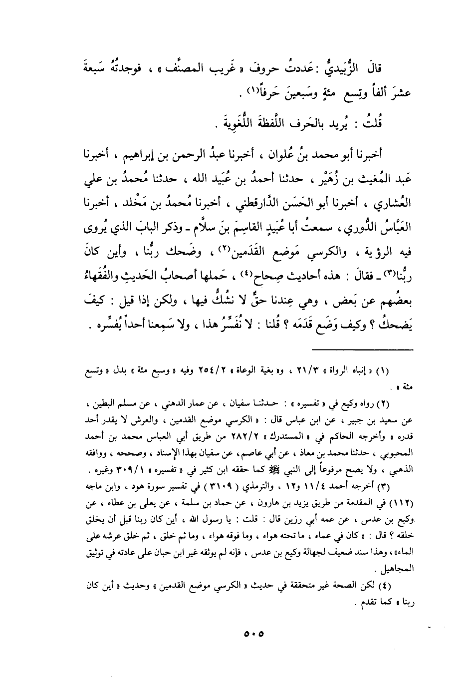 أَخْبَرَنَا أَبُو مُحَمَّدٍ بنُ عُلْوَانَ، أَخْبَرَنَا عَبْدُ الرَّحْمَنِ بنُ إِبْرَاهِيْمَ، أَخْبَرَنَا عَبْدُ المُغِيْثِ بنُ زُهَيْرٍ، حَدَّثَنَا أَحْمَدُ بنُ عُبَيْدِ اللهِ، حَدَّثَنَا مُحَمَّدُ بنُ عَلِيٍّ العُشَارِيُّ، أَخْبَرَنَا أَبُو الحَسَنِ الدَّارَقُطْنِيُّ، أَخْبَرَنَا مُحَمَّدُ بنُ مَخْلَدٍ، أَخْبَرَنَا العَبَّاسُ الدُّوْرِيُّ، سَمِعْتُ أَبَا عُبَيْدٍ القَاسِمَ بنَ سَلاَّمٍ - وَذَكَرَ البَابَ الَّذِي يُرْوَى فِيْهِ الرُّؤْيَةُ، وَالكُرْسِيُّ مَوْضِعَ القَدَمَيْنِ (2) ، وَضَحِكُ رَبِّنَا، وَأَيْنَ كَانَ رَبُّنَا (3) - فَقَالَ: