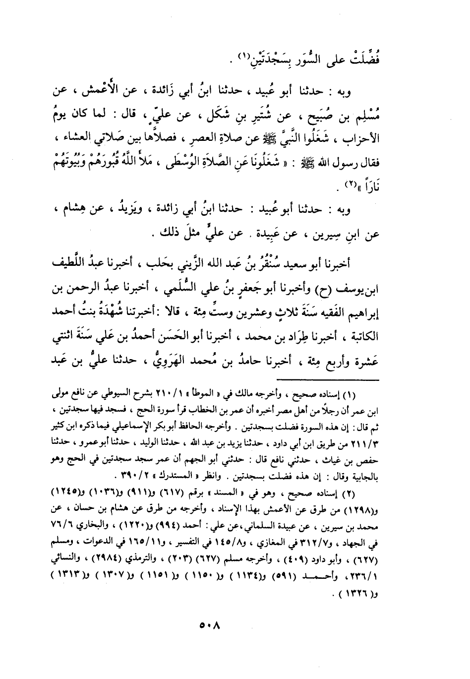 وأخرجه الحافظ أبو بكر الاسماعيلي فيما ذكره ابن كثير 3 / 211 من طريق ابن أبي داود، حدثنا يزيد بن عبد الله، حدثنا الوليد، حدثنا أبو عمرو، حدثنا حفص بن غياث، حدثني نافع قال: حدثني أبو الجهم أن عمر سجد سجدتين في الحج وهو بالجابية وقال: إن هذه فضلت بسجدتين. وانظر " المستدرك " 2 / 390.