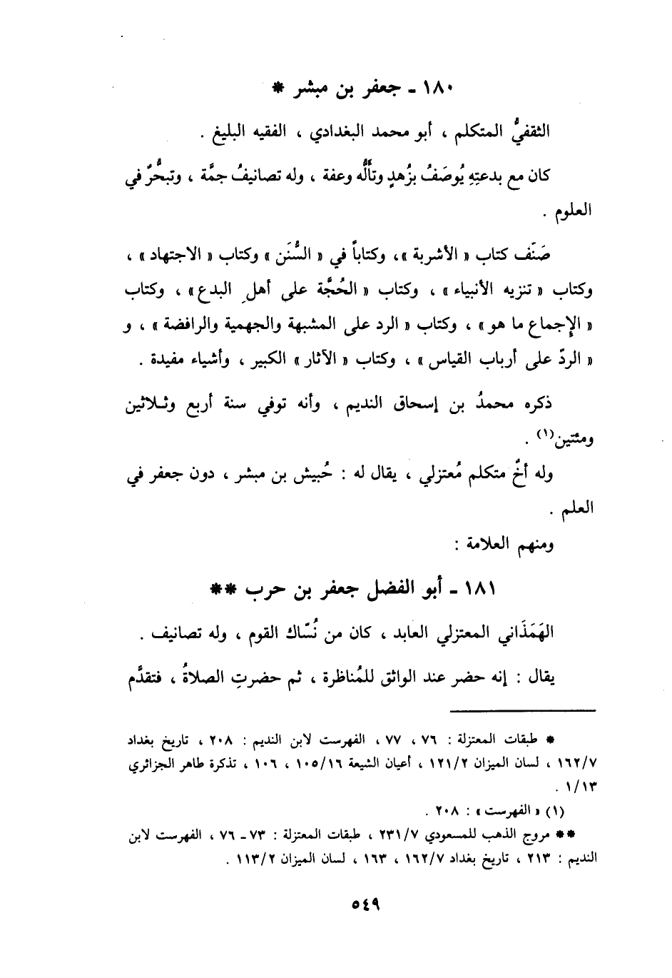(*) طبقات المعتزلة: 76، 77، الفهرست لابن النديم: 208، تاريخ بغداد 7 / 162، لسان الميزان 2 / 121، أعيان الشيعة 16 / 105، 106، تذكرة طاهر الجزائري 13 / 1.
