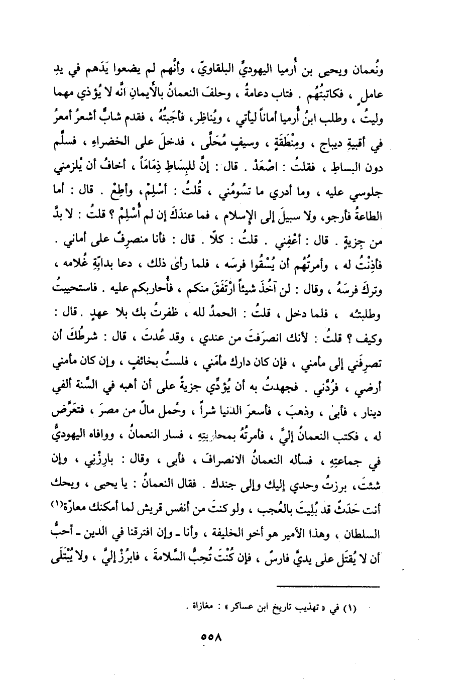 وَنُعْمَانَ وَيَحْيَى بنِ أُرمِيَا اليَهُوْدِيِّ البَلْقَاوِيِّ، وَأَنَّهُم لَمْ يَضَعُوا يَدَهُم فِي يَدِ عَامِلٍ، فَكَاتَبْتُهُم.