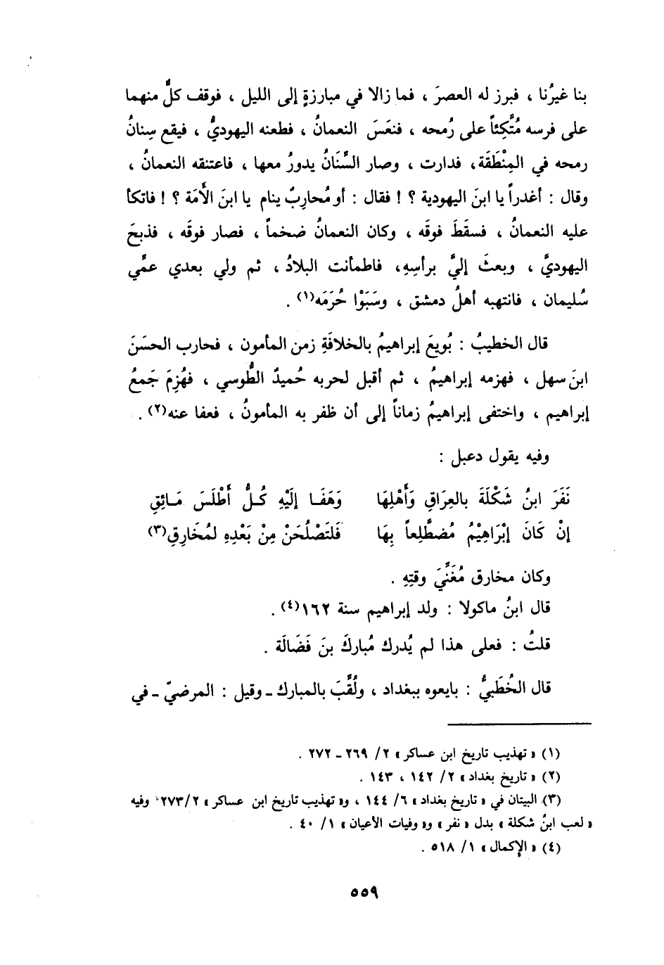 (3) البيتان في " تاريخ بغداد " 6 / 144، و" تهذيب تاريخ ابن عساكر " 2 / 273 وفيه " لعب ابن شكلة " بدل " نفر " و" وفيات الأعيان " 1 / 40.