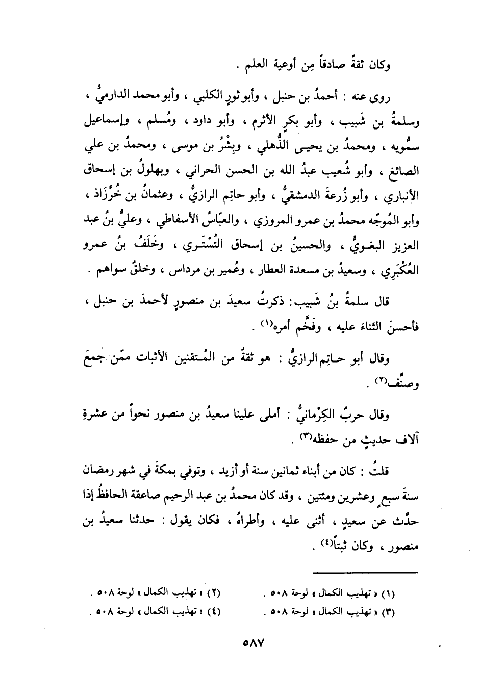 وَقَدْ كَانَ مُحَمَّدُ بنُ عَبْدِ الرَّحِيْمِ صَاعِقَةُ الحَافِظُ إِذَا حَدَّثَ عَنْ سَعِيْدٍ، أَثْنَى عَلَيْهِ، وَأَطْرَاهُ، فَكَانَ يَقُوْلُ: حَدَّثَنَا سَعِيْدُ بنُ مَنْصُوْرٍ، وَكَانَ ثَبْتاً (4) .