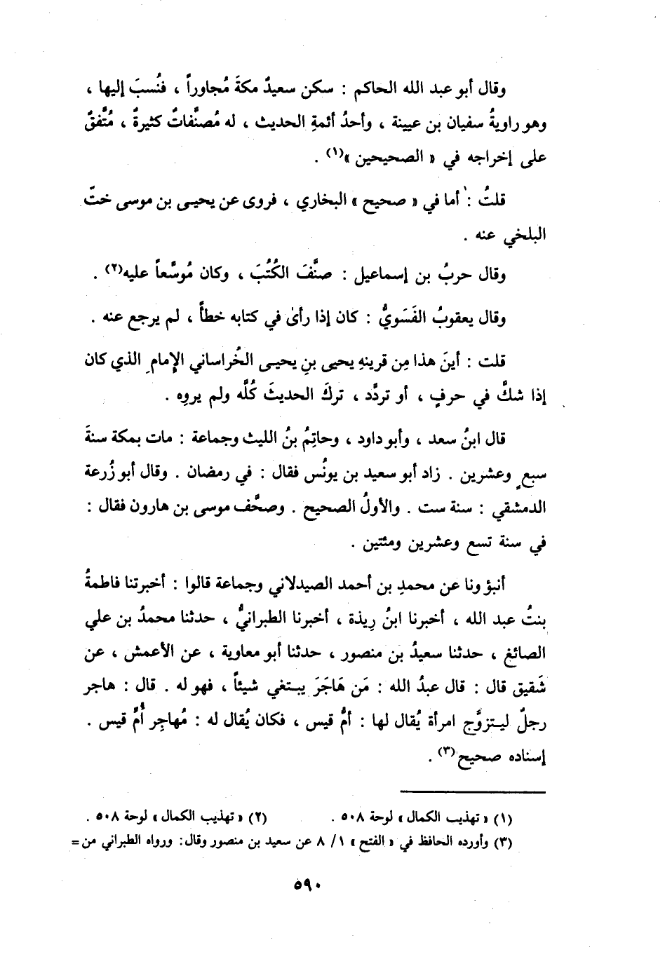 وَقَالَ أَبُو عَبْدِ اللهِ الحَاكِمُ: سَكَنَ سَعِيْدٌ مَكَّةَ مُجَاوِراً، فَنُسِبَ إِلَيْهَا، وَهُوَ رَاوِيَةُ سُفْيَانَ بنِ عُيَيْنَةَ، وَأَحَدُ أَئِمَّةِ الحَدِيْثِ، لَهُ مُصَنَّفَاتٌ كَثِيْرَةٌ، مُتَّفَقٌ عَلَى إِخْرَاجِهِ فِي (الصَّحِيْحَيْنِ (1)) .