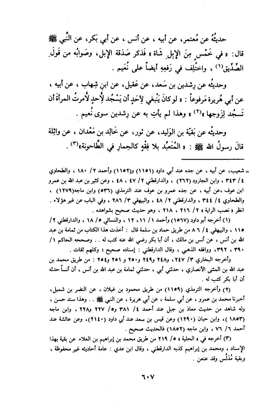 (1) أخرجه أبو داود (1567) وأحمد 1 / 11، 12، والنسائي 5 / 18، والدارقطني 2 / 115، والبيهقي 4 / 86 من طريق حماد بن سلمة قال: أخذت هذا الكتاب من ثمامة بن عبد الله بن أنس، عن أنس بن مالك، أن أبا بكر رضي الله عنه كتاب له.